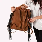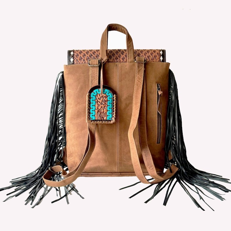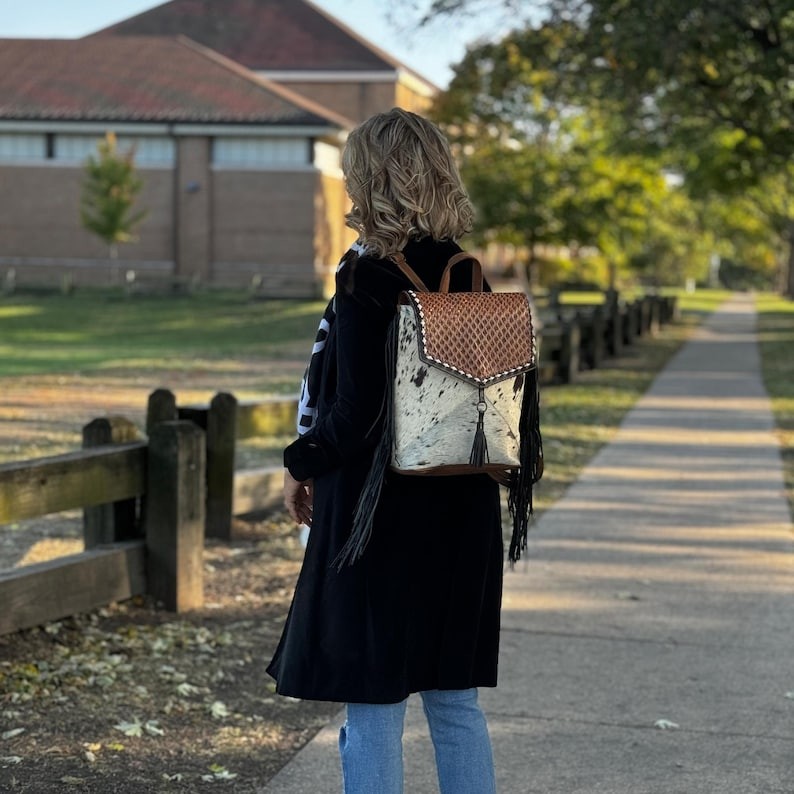 Description Step out in western style with this handcrafted cowhide and leather backpack , designed with fringe details, a hidden back zipper pocket, and plenty of space for your essentials, including a 15" laptop. Both practical and eye-catching, this backpack blends rustic charm with modern functionality. Specifications: Dimensions: 11" W x 13" H x 4.5" D Material: Genuine cowhide and premium leather Color: Natural cowhide pattern with a tooled leather flap Straps: Adjustable shoulder straps for comfort and style Closure: Secure zip and flap closure Compartments: Internal pockets, hidden back zipper pocket, external zipper pocket Laptop Fit: Fits laptops up to 15" Key Features: ✔️ One-of-a-kind cowhide pattern no two bags are alike ✔️ Hidden back zipper pocket for secure storage ✔️ Spacious interior fits books, everyday essentials, or a 15" laptop ✔️ Comfortable adjustable straps for daily wear ✔️ Fringe trim adds western-boho flair ✔️ Strong leather craftsmanship with durable hardware Why You’ll Love It: Perfect for work, school, travel, or casual use Blends western charm with everyday practicality A unique backpack that stands out while staying functional Carry your essentials in style with this western cowhide leather fringe backpack , a rustic, versatile, and durable option built to last. Condition: New with tags