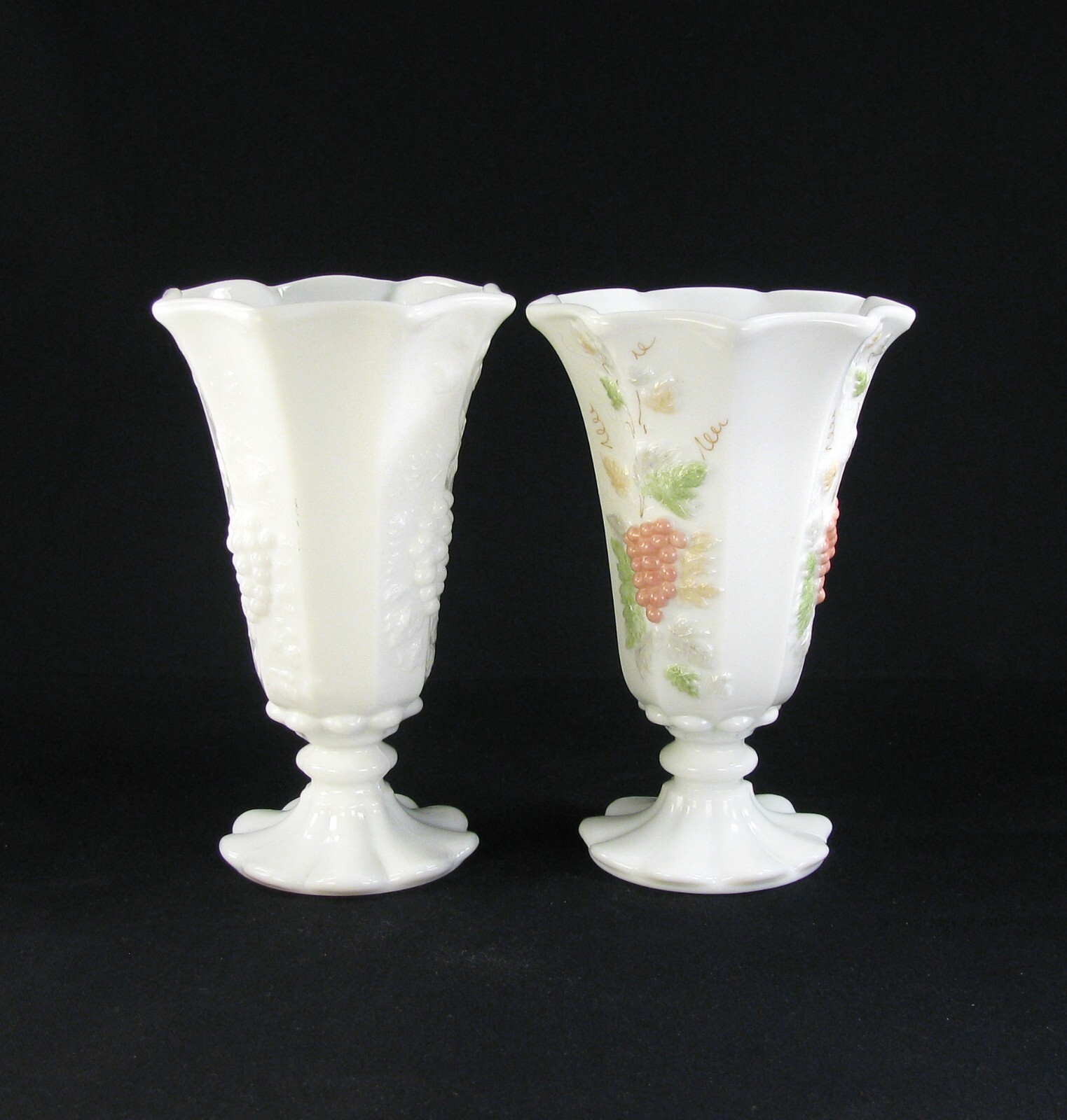 The Westmoreland Glass Co., 1889-1984, made this pair of Milk Glass Paneled Grape Scallop Footed (mold #PG-37) vases. One is plain and the other is hand painted with what was called Pastel Fruit which was made in 1963. They are marked on the underside with the factory's WG logo. Each vase is about 6" tall. No damage found. Combined shipping with other items may be sent Priority Mail depending weight, size of box, value of combined items, etc. Buyer pays for insurance over $100. Inv. #517