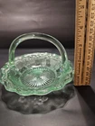 SUPER BRIGHT No chips or cracks. Great condition! The Westmoreland Woolworth Green Grape & Leaf 5.5" Basket is a beautifully crafted piece of decorative cookware, featuring a charming green leaf pattern in a Vaseline glass production style. This unique bowl by Westmoreland is perfect for collectors or those looking to add a touch of vintage charm to their home decor. Its elegant design and high-quality craftsmanship make it a standout piece in any kitchen or dining room.