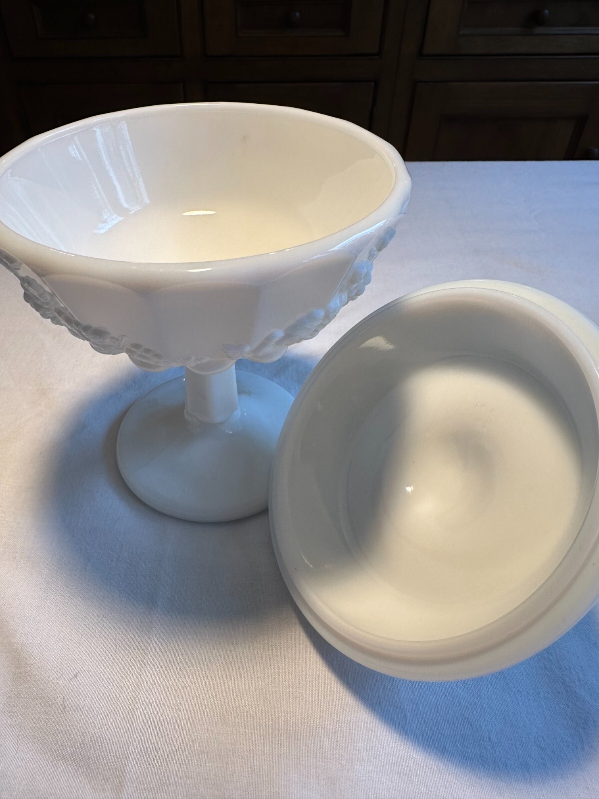 ITEM DESCRIPTION Westmoreland paneled grape pattern footed bowl/dish with lid. 5" tall. NO flaws. Beautiful vintage piece. Thank you for looking at my auctions and hoping to do 5 star business with you! I love combined shipping. Take note of my measurements . I take a lot of time to describe my items as thoroughly as possible. Clothing is given as many measurements as I can provide, if you need more, please write to me before bidding so I can provide you with your needed measurements for accurate fit. Please please please take note of measurements for accurate fit. Thank you for stopping by my auctions. As you can see from my feedback, I take my eBay reputation very seriously. Should you have any questions prior to bidding, I welcome your questions and usually respond very quickly. FEEDBACK: I will wait for your item to be delivered safely to you. Positive feedback should be the goal of each and every transaction. If there should be any issue, please address your issue promptly so I can turn the transaction to your satisfaction quickly and make our interaction a five-star experience. Wishing you a happy and healthy day.