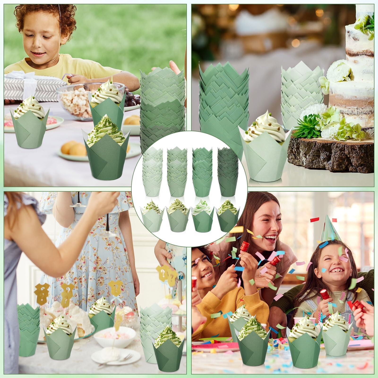 Whaline 400Pcs Sage Green Tulip Cupcake Liners Greaseproof Muffin Baking Liners Green Gradient Tulip Cupcake Wrappers Baking Cup for Bridal Baby Shower Wedding Birthday Party Decor Product Details Color: Sage Green Brand: Whaline Material: Paper Reusability: Disposable Occasion: Bridal Shower, Wedding, Baby Shower, Birthday Color: Sage Green Brand: Whaline Material: Paper Reusability: Disposable Occasion: Bridal Shower, Wedding, Baby Shower, Birthday Material Feature: Disposable Shape: Tulip Size: 2 x 3.1 inch Manufacturer: Whaline Number of Items: 400 Item Diameter: 2 Inches Item Weight: 15.2 ounces Item model number: W13411 Date First Available: May 17, 2024 Gradient Sage Green Tulip Cupcake Liners - Featuring gradient green and tulip shapes, refined and elegant, these cupcake liners are perfect decorations for party table. Abundant Quantity - A total of 400pcs Cupcake liners with 4 designs, 100pcs of each, are included in the package, sufficient to meet your daily use or party supply. Safe To Use - Made of quality paper material, these disposable cupcake wrappers are safe, odorless, wrinkle resistant and grease-proof, you can rest assured to use. Size Details - The bottom diameter of each cupcake wrapper measures about 2 inches, and it measures about 3.1 inches in height, lightweight and easy to carry or store, suitable for holding cakes, cookies, muffins, candies, chocolates, cakes, nuts, pastry and other snacks. Wide Application - Our cupcake wrappers can be applied in many occasions, such as baby shower, bridal shower, wedding, birthday, garden party, tea party and other occasions. Features & Benefits: 400pcs cupcake liners, delicate and lightweight, made of premium paper material, safe and odorless, abundant quantities that can meet your needs for daily use or party supply. Our cupcake liners can be applied in many occasions, to hold cakes, muffins, cookies, candies, chocolates, nuts, pastries and other snacks, perfect for party table decor. Specifications: Size: 2 x 3.1 in Material: paper Package includes: 400 x cupcake liners