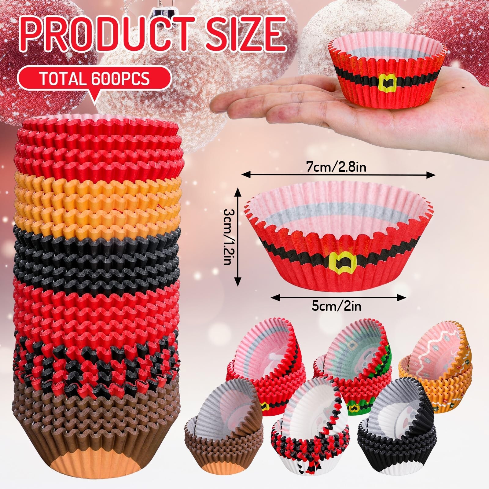 Whaline 600Pcs Christmas Character Cupcake Liners Santa Elves Snowmen Reindeer Gingerbread Penguin Cupcake Wrappers Baking Cups Holders Xmas Holiday Character Muffin Liners for Party Supplies Decor Product Details Color: Multicolor Brand: Whaline Material: Paper Reusability: Disposable Occasion: Wedding, Christmas, Birthday Color: Multicolor Brand: Whaline Material: Paper Reusability: Disposable Occasion: Wedding, Christmas, Birthday Material Feature: Disposable Shape: Round Manufacturer: Whaline Number of Items: 600 Package Dimensions: 6.81 x 3.03 x 2.95 inches Item Weight: 8.4 ounces Item model number: W11065 Date First Available: September 26, 2023 Christmas Character Cupcake Liners - Featuring Christmas cartoon characters, such as snowmen, gingerbread men, Santa, reindeer, penguins, etc., cute and festive, these cupcake liners are perfect for party supply. Abundant Quantity - Cupcake liners with 6 styles, 100pcs per design, 600pcs in total, are included in the package, sufficient to meet your daily use or party supply. Safe To Use - Made of quality paper material, these disposable cupcake wrappers are safe, odorless, wrinkle resistant and grease-proof, you can use them with confidence. Size Details - The bottom diameter of each cupcake wrapper measures about 5cm/2 inch, its opening diameter measures about 7cm/2.8 inch, and it measures about 3cm/1.2 inch in height, lightweight and easy to carry or store, suitable for holding cakes, cookies, muffins, candies, chocolates, cakes, nuts, pastry and other snacks. Wide Application - These cupcake wrappers can be applied in many occasions, such as Christmas party, holiday, post-match celebration, birthday party, wedding, family gathering, and more. Features & Benefits: 600pcs cupcake liners come with Christmas elements, delicate and lightweight, made of premium paper material, safe and odorless, abundant quantities that can meet your needs for daily use or party supply. Our cupcake liners can be applied in many occasions, such as Christmas party, holiday, post-match celebration, birthday party, wedding, family gathering, and more, to hold cakes, muffins, cookies, candies, chocolates, nuts, pastries and other snacks. Specifications: Size: 5 x 3cm/2 x 1.2 inch Material: paper Package includes: 600 x cupcake liners
