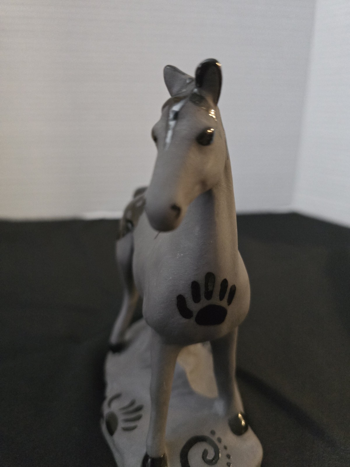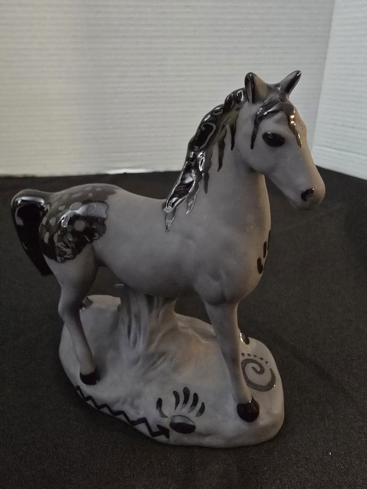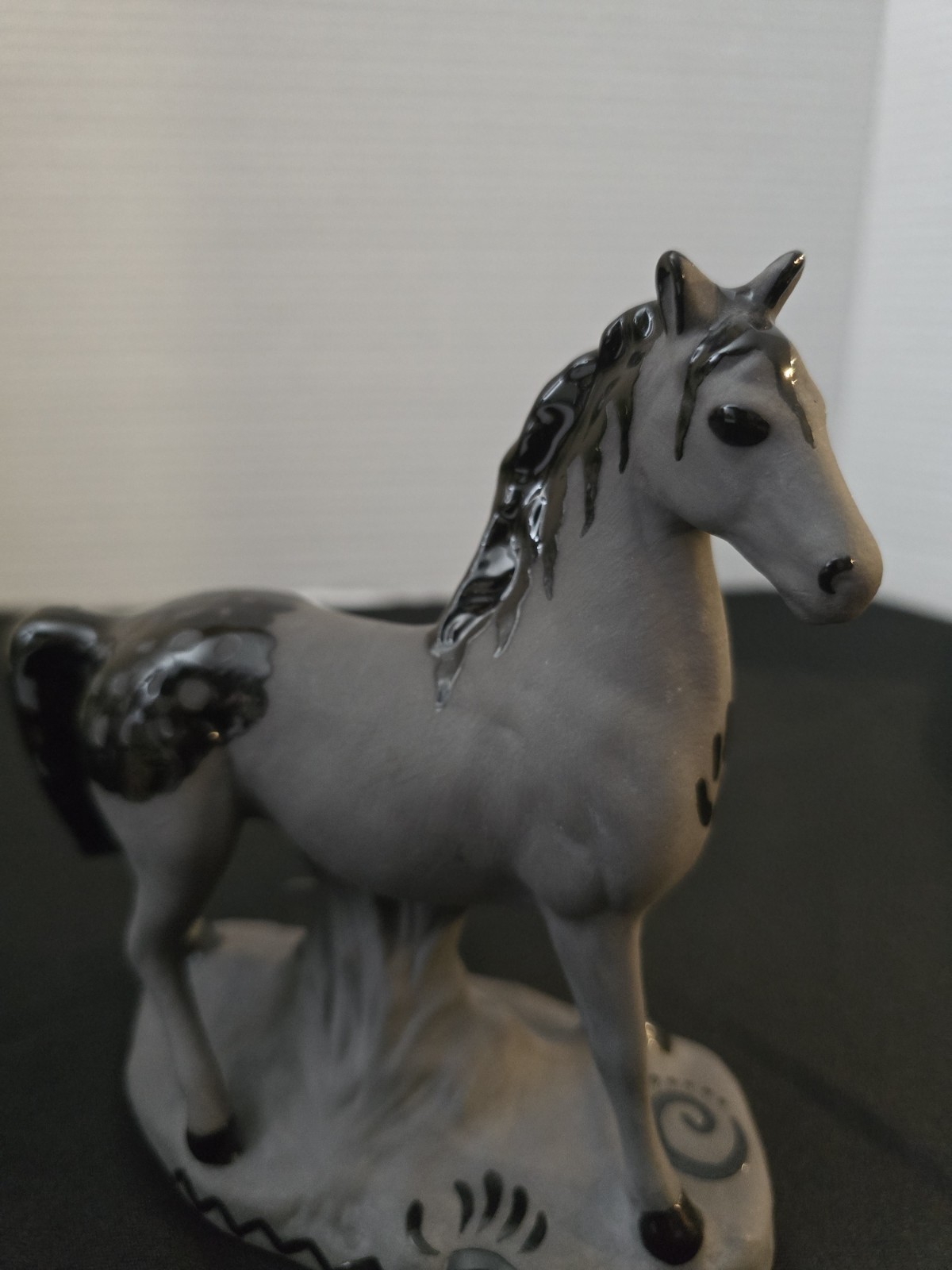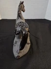The product is a vintage ceramic gray black horse figurine signed by artists Martinez. Made of porcelain, this collectible item showcases a detailed depiction of a horse, making it a unique and artisanal piece for horse enthusiasts or collectors of animal figurines. The signature by the artists adds a personal touch to the craftsmanship and adds value to the overall piece.
