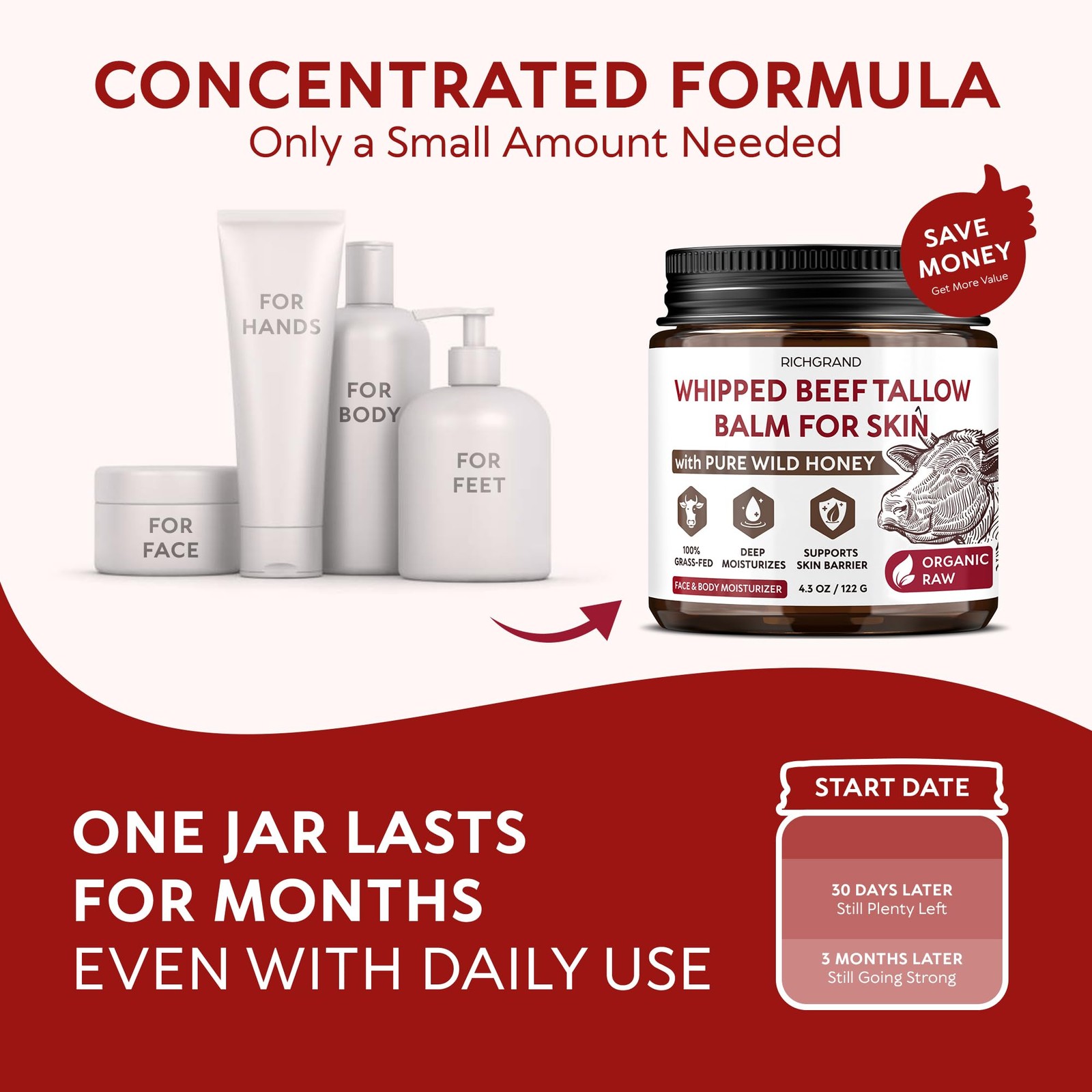 Beef Tallow for Skin - Whipped Grass-Fed Moisturizer with Wild Honey & Beeswax, Nourishing Care for Dry, Sensitive Skin: Our whipped tallow and honey balm wraps your skin in comfort, restoring softness to dry areas on face, hands, and body - like a daily ritual your skin learns to love Velvety Texture, Fast Absorption: This whipped beef tallow for skin melts instantly, soaking in without residue. Your skin feels smooth, balanced, and cared for - never sticky or heavy, always naturally nourished Only What Works, Nothing That Doesn’t: Unlike creams filled mostly with water, our beef tallow moisturizer contains no fillers - just grass-fed beef tallow, wild honey, and beeswax. Every ingredient is active, purposeful, and skin-loving Daily Ritual for Whole-Body Comfort: Use this tallow face moisturizer morning and night to support skin that feels dry, rough, or imbalanced. It becomes a grounding part of your routine - simple, calming, deeply satisfying One Jar, Full-Body Value: A little goes a long way. Our 4.3 oz jar of whipped tallow balm delivers months of concentrated nourishment for your face, hands, and body - made for those who value clean simplicity Cut the clutter from your skincare. This beef tallow for skin balm is the clean, minimal solution for dry skin, crafted to do more with less. Made from grass fed beef tallow, wild honey, and beeswax — it gives you deep, lasting moisture with no fillers. It’s your daily multitasker: a tallow face moisturizer, body balm, hand cream, and all-around hydrator. Whipped to perfection, it absorbs fast, feels rich, and leaves your skin feeling soft — not oily. With no added water or synthetics, this beef tallow moisturizer is ultra-concentrated. One jar can easily outlast traditional creams, giving you weeks or months of daily use. Designed for smart skincare lovers who want performance without excess, this organic beef tallow for skin simplifies your routine while doing exactly what your skin needs. Whether you’re traveling, minimizing your shelf, or just tired of products that don’t deliver, this tallow and honey balm replaces the clutter with results. Shipping We offer FREE shipping on all orders! We ship within Three business days of payment, usually sooner. We use a selection of shipping services such as UPS, FedEx, USPS etc. We only ship to the lower 48 states, no APO/FPO addresses or PO Boxes allowed. Local pickups and combined shipping options are not provided at this time. Return You can return a product for up to 30 days from the date you purchased it. Any product you return must be in the same condition you received it and in the original packaging. Please keep the receipt. Payment We accept payment by any of the following methods: PayPal Please pay as soon as possible after winning an auction, as that will allow us to post your item to you sooner! Feedback Customer satisfaction is very important to us. If you have any problem with your order, please contact us and we will do our best to make you satisfied. Contact Us If you have any queries, please contact us via ebay. We usually respond within 24 hours on weekdays. Please visit our eBay store to check out other items for sale! Thank you for shopping at our store.