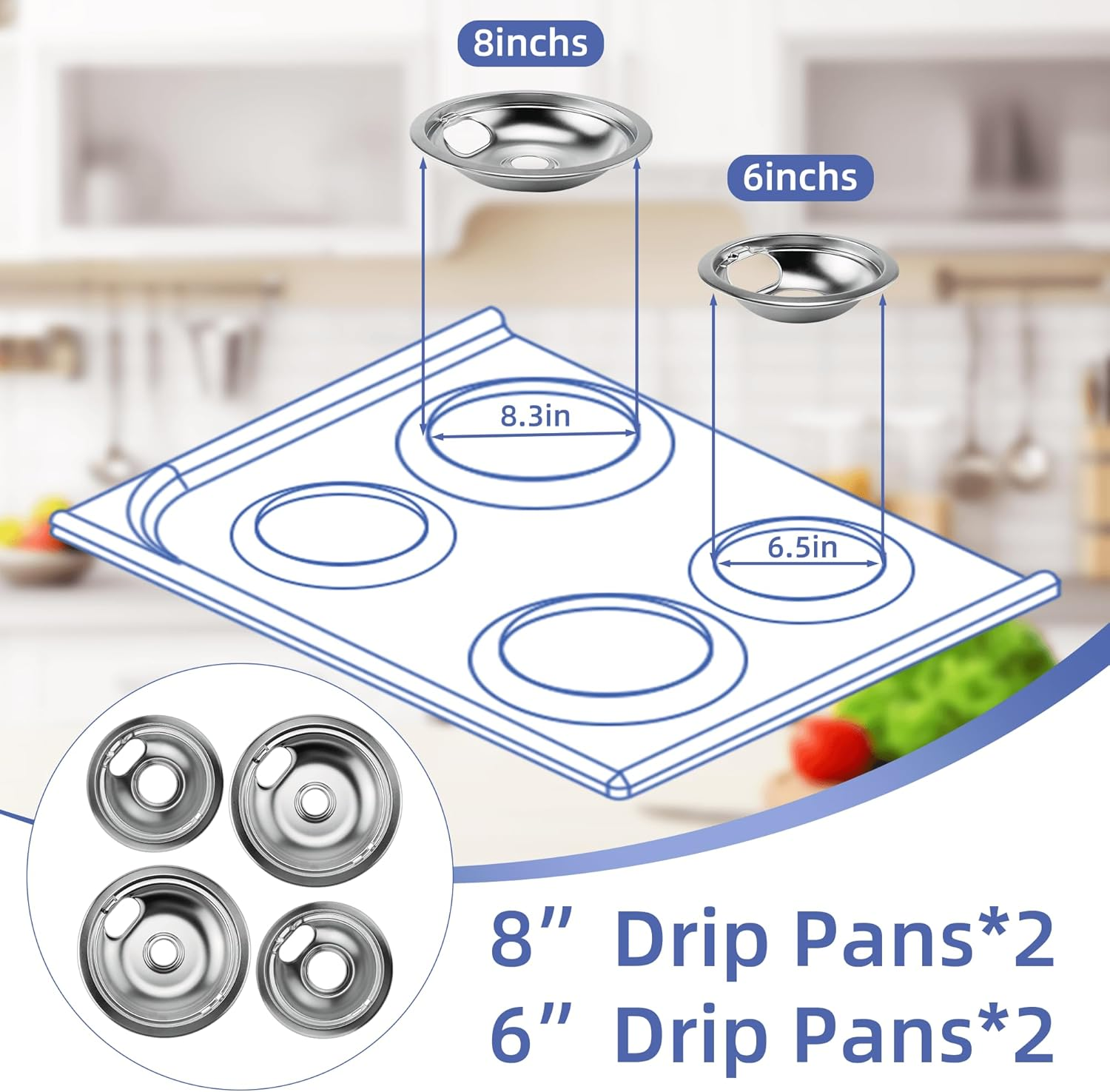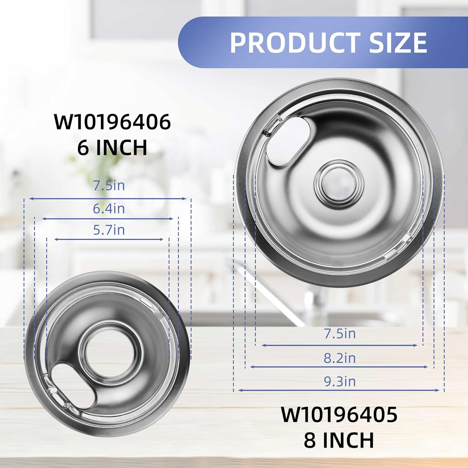 Store New Arrivals Add to Favorite View Feedback Contact W10196406 and W10196405 Chrome Stove Burner Drip Pan Set for Whirlpool Description Item model number WPW10196406 WPW10196405 Part Number WPW10196406 WPW10196405 Batteries Required? No Item Package Quantity 4 Material Stainless Steel Country of Origin China Item Weight 1.08 pounds Batteries Included? No Package Dimensions 10.43 x 9.65 x 2.76 inches Manufacturer Pulluty High quality chrome plated steel Includes 2 x W10196406 (6'' chrome plated burner drip pans), 7.45" diameter and 2 x W10196405 (8'' chrome plated oven drip pans), 9.35" diameter. The electric oven drip tray is made of durable chrome plated steel with environmentally friendly plating technology. Silver color. The 8 inch W10196405 and 6 inch W10196406 drip tray sets fit most whirlpool electric stove drip pans whirlpool 465 parts Maytag and Kenmore Sears most plug-in electric stove tops. The chrome stove drip tray fits the stove properly and prevents the drip tray element from wobbling, thus preventing the cookware on the stove from wobbling. WPW10196406 Replaces: 101AM 29648114203427 14218107 3150246P 4351458 4364193, etc. WPW10196405 Replaces: 0042142 0304979 0B04300211 0P00801311 305839K 14219066, etc. Caution: Prevent burns. Wait for the surface to cool down to a certain level before installing the drip tray of the electric furnace. Electric stove burner drip tray speeds up cooking time and saves energy costs. The chrome-plated electric stove burner drip tray catches water (oil/drips/food) that escapes from cookware on the burner while cooking. The burner drip tray is also durable, non-stick, easy to clean and can be cleaned with cloth, paper towel, soap or even dishwasher safe. Keeps your kitchen clean and tidy. If you are not sure if the oven burner drip pans is right for you, please contact us and we will be happy to help you. Please don't hesitate to contact us. We will try our best to satisfy every customer. Product Description ABOUT US We offer the best prices around on high quality products. Our E-store includes media such as books, movies, music and games while offering electronics, toys, sporting apparel, clothing, tools, general home, garden items and more. SHIPPING We are always working hard to ensure your package arrives as soon as possible. Please understand that some factors like weather, high postal traffic, and the performance of shipping companies are outside of our control. We offer free shipping to the lower 48 states and ship within 2 business days of payment, usually sooner. We do not accept P.O. Boxes. Please provide a physical address. RETURNS We offer a 30-Day Return Policy on items which you are not completely satisfied with. You have the option for a full-refund or an exchange of the item. No returns are available on items shipped outside of the USA. PAYMENT We accept PayPal. CONTACT US This page content is yet to come Please ad us to your favorite seller and visit again later Thank You CUSTOMER SATISFACTION We try our very best to make sure every customer is completely satisfied. If there's a problem, message us! We're happy to help.