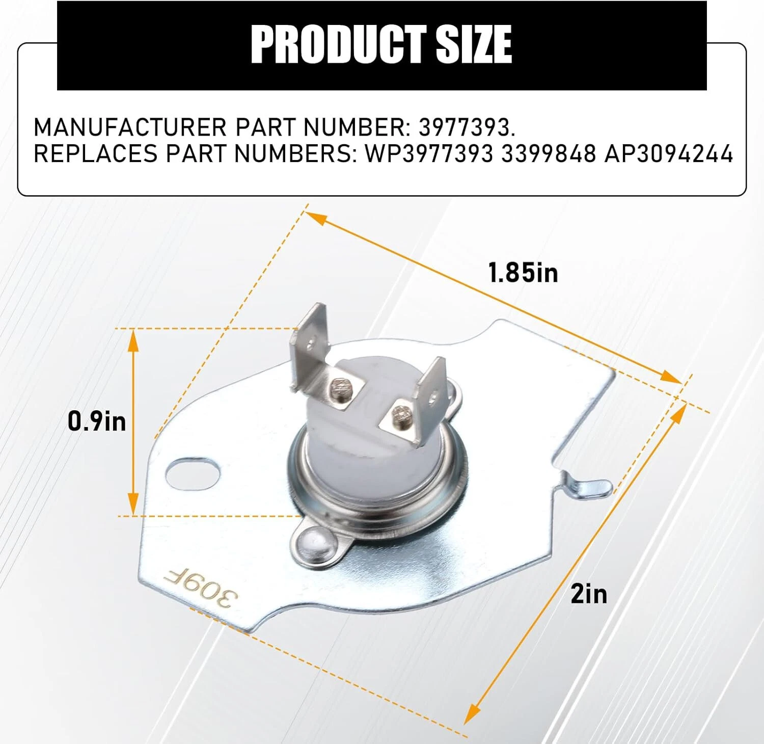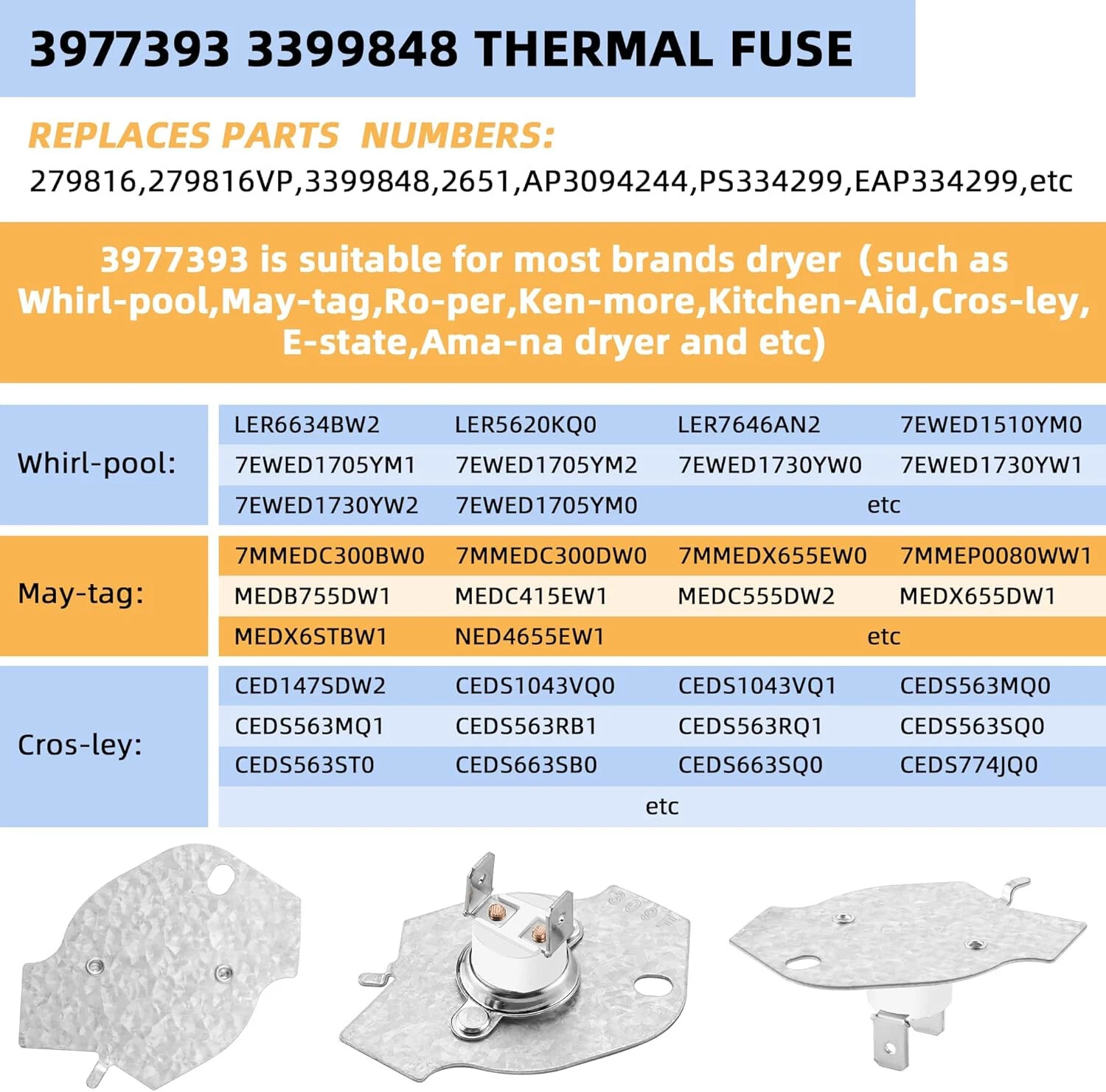 Item always Will Be Sent Out in 24 Hours From Monday to Saturday From California USA With USPS Tracking No. Product Description: · ✅[Item Number] : 3977393 thermal fuse (6pcs). · ✅[High Quality]: The replacement parts are made by durable high quality material and well-tested by the manufacturer. · ✅[Lower Price] : Enjoy factory direct prices when ordering from us! Save a lot of money and time by replacing parts of the product. · ✅[Easy To Install] : Direct replacement for a proper fit and easy installation, meets or exceeds OEM standards, 100% tested before shipping. · ✅[Replace Part Number]: 3977393 Dryer Thermal Fuse is made exactly fit for most top name brands (Whirlpool, Kenmore, Maytag, Roper, KitchenAid, Crosley, Estate, Inglis, Amana, Admiral, Magic Chef), fits a variety of models and replaces part numbers: 2651, 279816, 279816VP, 3399848, 3977393, AP3094244, PS334299. If you are unsure whether this part will fit your model, please send us an inquiry with your model so we can inform you if it fits or not. Payment 1.We only accept PayPal. Credit card payment can also be made via PayPal.eBay Immediate Payment via PayPal. 2.Please fill in a valid contact address. Shipment Items are usually shipped 1 business days after payment has been received. We do not ship on weekends and holidays. Sellers are not responsible for service transit time. Transit times are provided by the carrier, exclude weekends and holidays, and may vary with package origin and destination, particularly during peak periods. Return Policy Out 30-day Satisfaction Guarantee assures our customers that they will receive all orders promptly and exactly as described. In addition , it allows customers to return new and unused products in their original factory condition for any reason within 30 days from the date of purchase. Notice: 1.All returns must be pre-approved by Seller and have a return merchandise authorization (RMA) number. Any problem about item, Please Send the eBay message to us ,we will respone in 24 hours 2.Buyers are responsible for appropriate packing, returning shipping cost, insurance and returning the item in “new” condition. Used items will not be accepted for return. 3.We will replace the returning item with an identical item, issue a full refund. Contact us 1.If for some reason there is any issue with the purchase, please contact us prior to leaving any negative or netrual feedback, and we will work with you to have it resolved.