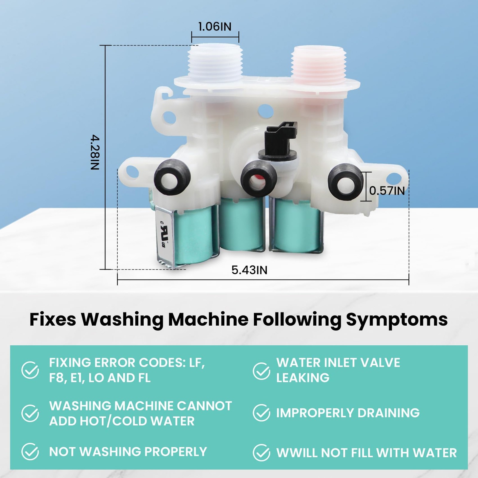 W11096268 (W11220230) water inlet valve:W11096268 (W11220230) water inlet valve controls the water flow into the washer.W11096268 (W11220230) water inlet valve has two threaded ports to control hot and cold water respectively.(120V 60Hz) Directly Replaces:W11220230 W10632527 W10758829 W10853296 W11096268 AP408 PS12349461 EAP12349461 etc. Solve The Following Problems:Compatible with whirl-pool ken-more error codes: E1 F8 FL LF LO etc. The washer not to fill properly or not fill at all etc. Fits Brands and Compatible Models :Compatible with whirl-pool ken-more etc.Compatible Models:7MWTW7000EW1 7MWTW7300EW0 7MWTW7300EW1 MVW6200KW0 MVW6230HC0 WTW6120HC0 WTW6120HC1 WTW6120HW0 WTW7000DW0 WTW7000DW1 WTW7000DW2 WTW7000DW3 WTW7000DW4 WTW7040DW0 WTW7040DW1 WTW7040DW2 WTW7120HC0 WTW7300DC0 WTW7300DW0 WTW7300DW1 WTW7300DW2 WTW8000DW0 WTW8000DW1 WTW8000DW2 WTW8000DW3 WTW8000DW4 WTW8000DW5 WTW8040DW0 WTW8040DW1 WTW8040DW2 WTW8040DW3 WTW8040DW4 etc. Azdele Professional Customer Service:I hope our W11096268 (W11220230) water inlet valve can solve your problem.If you need any assistance, please contact our 24-hour online service team. Azdele continually provides the warm shopping experience for all customers.We will show you a sincere attitude and satisfactory solution.