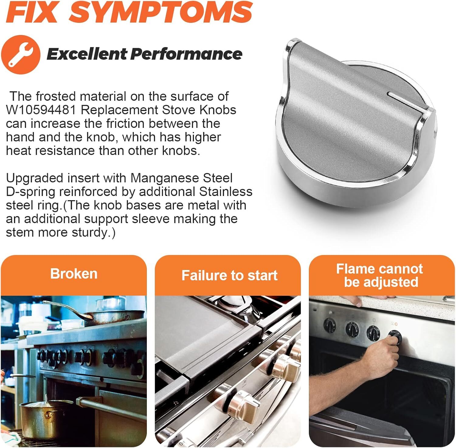 𝙐𝙥𝙜𝙧𝙖𝙙𝙚𝙙 W10594481 Gas Range Stove Knobs 5pcs Replaces for Whirlpool Range/Oven WCG97US6DS00 WCG97US0DS00 - W10594481 Stainless Steel Cooker Stove Control Knobs Replaces AP6023301, measures 8"L x 1.9"W ✔✔【W10594481 CONTROL KNOBS】: W10594481 Stove Knobs allows you to control the size of the flame coming from your cooktop burner. Stem is reinforced with aluminum ring. The surface of knobs of is made of frosted material, which has higher heat resistance than other knobs. The specification is 2.1in high, 1.9 in wide. The knob has a 0.18 inch "D" shaft at the bottom, When the direction is "D", our valve pointer points to 12 o'clock. If your knob has “off””Ignite” and other information on the side of the knob or front stem and back line of D are not parallel it's not compatible with your range,please do not buy this product,the model you need is W10766544 ✔✔【HIGHER HEAT RESISTANCE】: W10594481 5pcs Cooker Stove Control knob Replacement for Whirlpool Range/Oven,with a 0.18in "D" axis.►The 5 x W10594481 Range Surface Burner Knob is a direct replacement for the cooktop on your Kitchen. The burner control knob allows you to control the size of the flame coming from your cooktop burner. The frosted material on the surface of W10594481 Replacement Stove Knobs can increase the friction between the hand and the knob, which has higher heat resistance than other knobs. Upgraded insert with Manganese Steel D-spring reinforced by additional Stainless steel ring.The knob bases are metal with an additional support sleeve making the stem more sturdy ✔✔【WIDELY COMPATIBLE】: Package Includes 5 x Stainless Steel Cooker Stove Control Knobs W10594481.►W10594481 Gas Range Stove Knobs repalces Part W10594481, AP6023301, PS11756643, EAP10594481, WCG97US0DS00, WCG97US6DS00,WPW10594481, AP6023301, W10594481, PS11756643, B01KR8F5EU and more►5 Pack WPW10594481 Whirlpool Gas Cooktop Control Knobs Suitable for Models WCG97(WCG97US0DS00,WCG97US6DS00,WCG55US0HS00,WCG51US6DB00,WCG51US6DB00 WCG55US6HS WEG745HOFSO) . ⚠️But not for WCG97US0DS ►This part fixes the following symptoms: ①Will not start ②Will not turn ③Will not stay on ✔✔【365 DAYS GUARANTEE】: W10594481 Range Replacement Knobs supports 365 days after-sales service. Our company attaches great importance to the shopping experience of each customer.Risk-free shopping, If you have any quality problem during guarantee period, please contact customer service in time. We will try our best to solve the problem. Customer satisfaction is our tireless pursuit ✔✔【DIY QUICK INSTALLATION】: Our pack includes 5 knobs, if you need to replace a button, you might as well replace them all to keep your cooktop consistent. The installation of W10594481 Stove Control Knobs does not require any tools. Mainly slide the old knob directly out of the valve stem, and then slide the replacement knob back to the valve stem. Do not bend the knob up or down. Simple operations can be easily completed in just a few seconds, providing convenience for your life