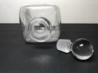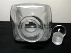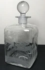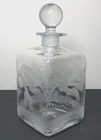 In a style of Queen Lace Crystal whiskey decanter, African wildlife motif etched Giraffe and Rhinoceros in Savannahs, measures 8" tall including stopper; 6 1/2" tall without the stopper and 4 1/2" in diameter or 3 1/2" wide each side. I don't want to pour water into decanter to measure the captivity, but I think about 750ml.