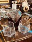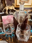 This product is a whiskey decanter set that includes a 750ml glass decanter with a diamond jubilee design and a lid/stopper. The set also comes with an mahogany wood base for display. The decanter is clear in color. The set is perfect for use in a bar setting and is ideal for whiskey enthusiasts.