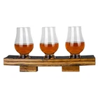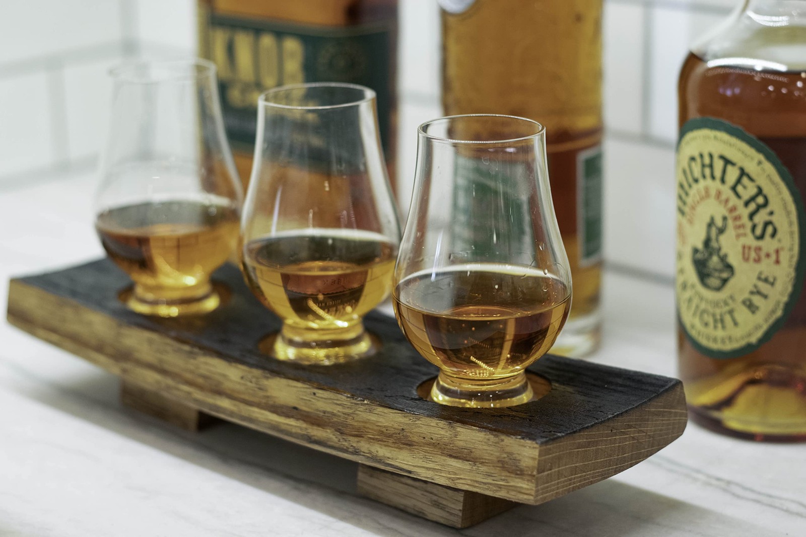 Experience your Whiskey with this Flight Tray and Tasting Glasses. Handmade in Texas from reclaimed whiskey, scotch, or bourbon barrels. When looking at the side of the barrel stave, you can see the Devil's Share or just how far the whiskey penetrated the barrel. You will find the barrel's provenance(the date when it was filled) engraved on the bottom of the barrel stave. The top of the flight board still retains the original char on it. They have been finished with an organic oil/wax to compliment their original character and to keep them looking great for years to come. After being sealed and protected you will not be able to smell the original barrel scent. Included are three Glencairn whisky glasses, designed by master distillers as the best way to enjoy a good whiskey. Unfortunately, Whiskey is not included but if you stop by my shop I will gladly share a bottle! Whiskey Flight Tray Made from Reclaimed Whiskey Barrels Includes Three Official Glencairn Whiskey Tasting Glasses Barrels Fill Date and Distillery is Laser Etched on the Bottom of the Whiskey Flight Tray Handmade in Texas by Whiskey Lovers for Whiskey Lovers Comes in a Gift Box