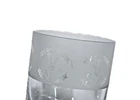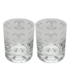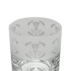 A set of two whisky glasses, drinking tumblers with an etched frosted animo glass thistle pattern by The Milford Company. Dimensions: 3.75" high 3.25" wide 10 oz capacity weighs 11 oz *One of the glasses has a small spot on the frosted glass. See the last photo.