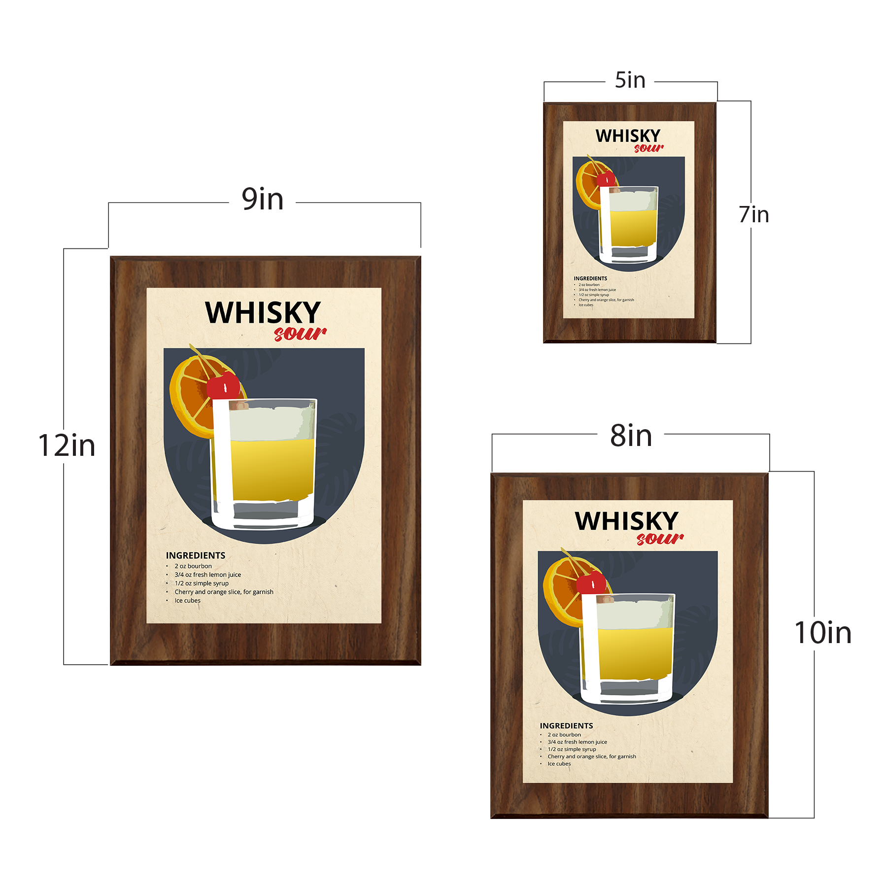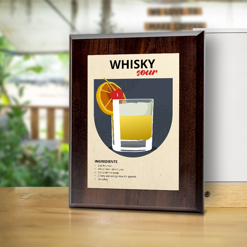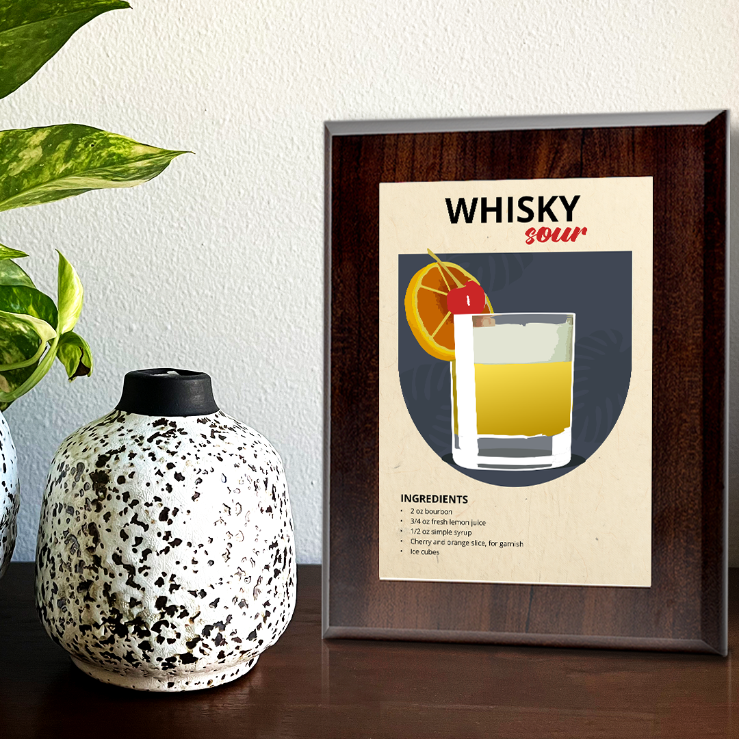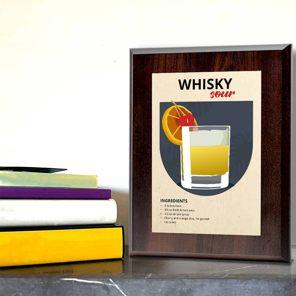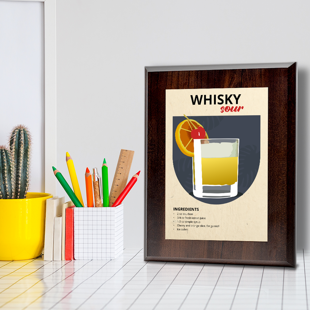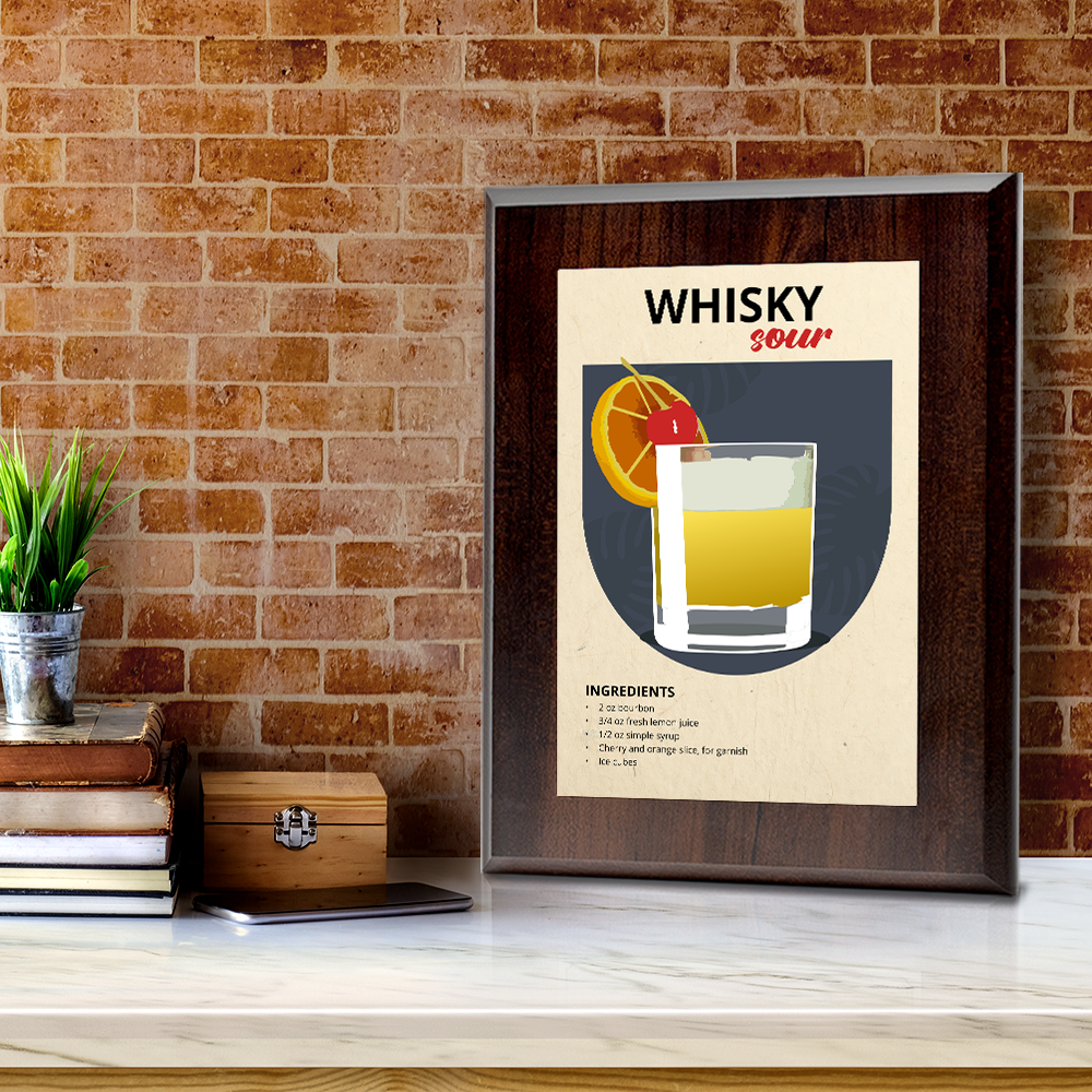 Elevate your space with our Whisky Sour wall plaque. Crafted with precision, each plaque features a solid Walnut finish wood base with a sleek aluminum plate, carrying a range of stylish and contemporary designs. Choose from three sizes - 7x5", 10x8", or 9x12" - and a stylish natural or black wood base. For easy installation, each plaque is equipped with pre-cut keyhole slots on the reverse side. Mount it securely on your wall or display it on a stylish acrylic easel for added versatility. Our commitment to quality extends to ensuring your plaque arrives in pristine condition. Each piece is carefully shrink-wrapped and protected with bubble wrap during transit, so you receive it exactly as envisioned. Transform your surroundings and make a lasting impression with these beautifully crafted pieces. It's more than decor; it's a reflection of your taste and a tribute to enduring elegance.