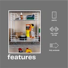 16.25x15x16.75 inch / Steel / Pantry Organizer Core Parameters Material: High-quality steel with durable powder paint coating Size: 16.25 inches D x 15 inches W x 16.75 inches H (41.3 cm D x 38.1 cm W x 42.5 cm H) Color: White Weight: 10 lb (4.5 kg) Technical Specifications 2-tier storage design with removable PEVA liners Maximum weight capacity: 33 lb (15 kg) Easy-mount full-extension ball-bearing sliding base Compatible with ventilated shelving or standard cabinetry Includes mounting hardware Package Information Package Dimensions: 16.25 x 15.00 x 16.75 inches (41.3 x 38.1 x 42.5 cm) Assembled Product Weight: 10 lb (4.5 kg)