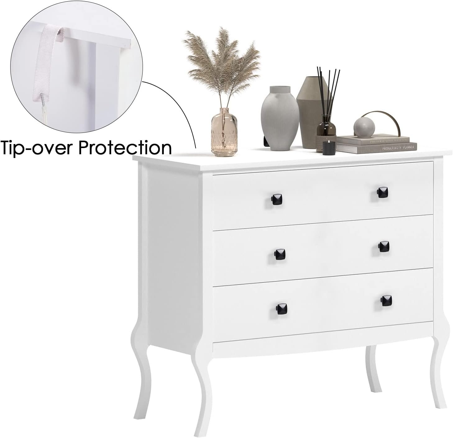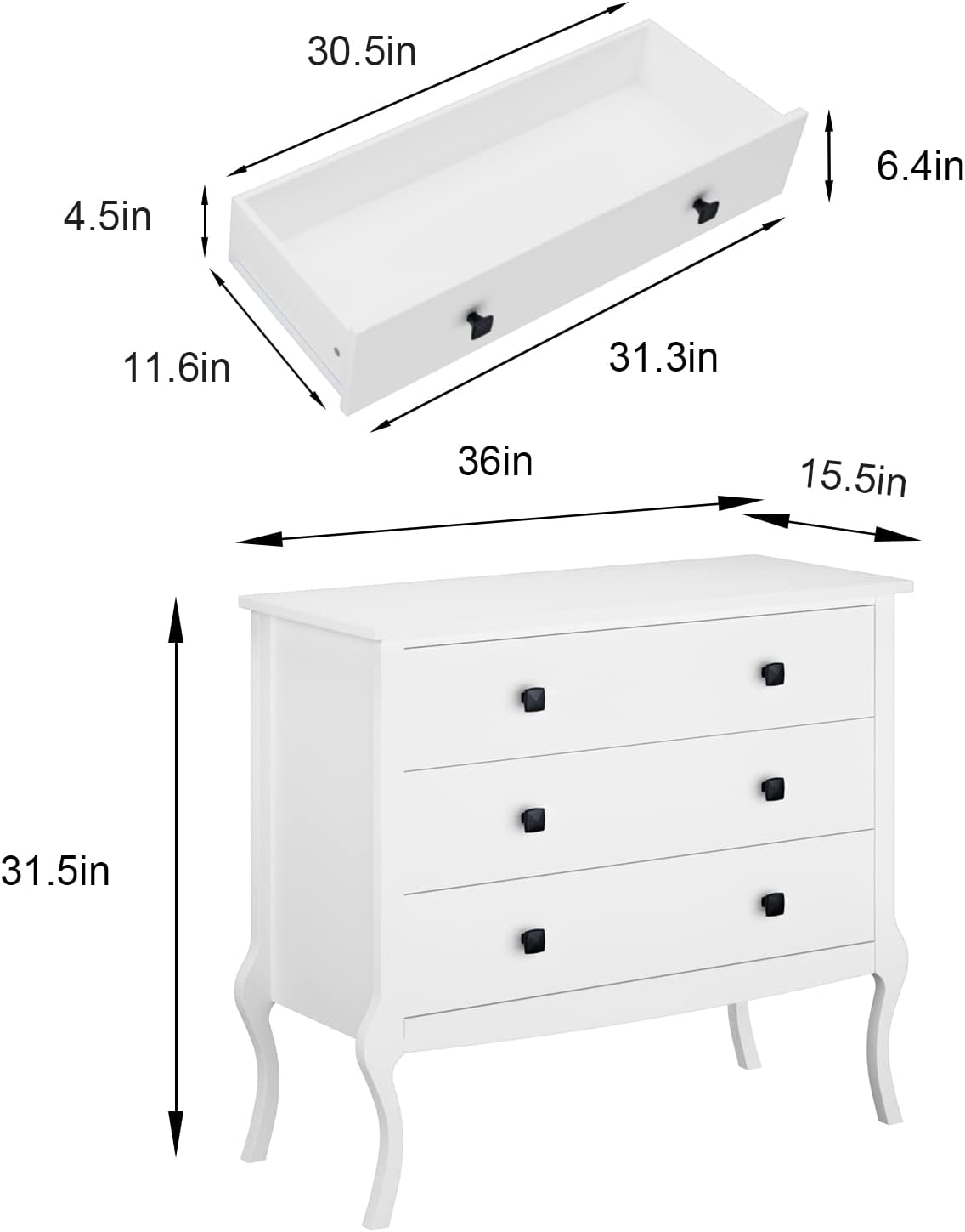 Store New Arrivals Add to Favorite View Feedback Contact White Dresser 3-Drawers Storage Cabinet with Wide Drawers and Curved Legs,Wooden Chest of Drawers Storage Organizer for Living Room Bedroom Entryway Hallway Description Item model number SP-10AKSFBCO8WH-US6 Room Type Bedroom,Kitchen,Living Room Product Dimensions 36"D x 15.5"W x 31.5"H Assembly Required Yes Mounting Type Freestanding Color 3-drawers Material Engineered Wood Finish Type Polished Furniture Finish White Country of Origin China Item Weight 50 pounds Size 36"D x 15.5"W x 31.5"H (3 Drawers) Model Name dresser Number of Pieces 1 Special Feature Sturdy Number of Drawers 3 Style Modern Product Care Instructions Wipe with Dry Cloth DIMENSION OF THE WHITE DRESSER:Overall size:36"Lx15.5"Wx31.5"H.Table tops can hold up to 44 lbs and drawers can hold up to 11lbs.Equipped with an anti-tipping device to hold the dresser securely in place. Perfect for living room, bedroom and anywhere you want. AMPLE STORAGE SPACE:Equipped with 3 wide drawers,the dresser is ready for clothes, toys ,makeup, underwear,books, keeping your home neat and tidy.It also can be used as bedroom nightstand,sofa side table, kitchen sideboard,etc. It will be ideal for Bedroom Living Room Hallway Entryway and so on. MODERN STORAGE CABINET:The elegant and modern look makes this white dresser even more charming and unique for your home.It will certainly meet the needs of people of different ages and tastes,perfect for any home style. STURDY WOOD DRESSER:Made from durable engineered wood, it adds extra sturdiness to this bedroom furniture. Extra support under the dresser and each drawer makes it even more stable.Also the natural white surface makes the dresser water-proof and long-lasting. EASY INSTALLATION:The white storage organizer will come with a detailed instruction and necessary accessories,so it will be easy and quick for you to assemble the dresser chest of drawer. No need to worry.Any problem when assembling,please feel free to contact us. Product Description Sogespower White Dresser 3-Drawers Storage Cabinet with Wide Drawers and Curved Legs,Wooden Chest of Drawers Storage Organizer for Living Room Bedroom Entryway Hallway Sogespower 3-Drawers Dresser Fit For Bedroom Living Room Entryway Hallway ,etc. Overall size:36"Lx15.5"Wx31.5"H 3 wide Drawers With Curved Legs Material:Wooden Storage Organizer for Your Bedroom Table's capacity is 44 lbs,while drawers is 15.43 lbs. Of course it will be a hit of your house. Natural white surface makes the dresser water-proof and long-lasting. Specifications Color:Modern White Elegant and Modern Style High Quality Of Wooden Easy Installation 3-Drawers Dresser ,ready for clothes, toys ,makeup, underwear,books Strudy White Dresser Equipped with curved legs,the overall style of the dresser looks more elegant.Also the natural white surface makes the dresser water-proof and long-lasting. Tip-over Protection The 3-Drawers Dresser has an anti-tipping device to hold it securely in place.Don't need to worry about the stability. It also will be suitable for families with small children. Storage Cabinet For Your Bedroom With ample storage space,the dresser will be ideal for bedroom living room hallway entryway kitchen and so on.Get one for your room now!! ABOUT US We offer the best prices around on high quality products. Our E-store includes media such as books, movies, music and games while offering electronics, toys, sporting apparel, clothing, tools, general home, garden items and more. SHIPPING We are always working hard to ensure your package arrives as soon as possible. Please understand that some factors like weather, high postal traffic, and the performance of shipping companies are outside of our control. We offer free shipping to the lower 48 states and ship within 2 business days of payment, usually sooner. We do not accept P.O. Boxes. Please provide a physical address. For shipping outside of the continental USA, we only use eBay's Global Shipping Program.The item is shipped to KY and then sent to the rest of the world. International customers are responsible for all duties and taxes. Continue to check out in order to calculate costs for shipping the item to your country. Messages regarding eBay's Global Shipping Program MUST be directed at eBay EXCLUSIVELY. RETURNS We offer a 30-Day Return Policy on items which you are not completely satisfied with. You have the option for a full-refund or an exchange of the item. No returns are available on items shipped outside of the USA. PAYMENT We accept PayPal. CONTACT US This page content is yet to come Please ad us to your favorite seller and visit again later Thank You CUSTOMER SATISFACTION We try our very best to make sure every customer is completely satisfied. If there's a problem, message us! We're happy to help.