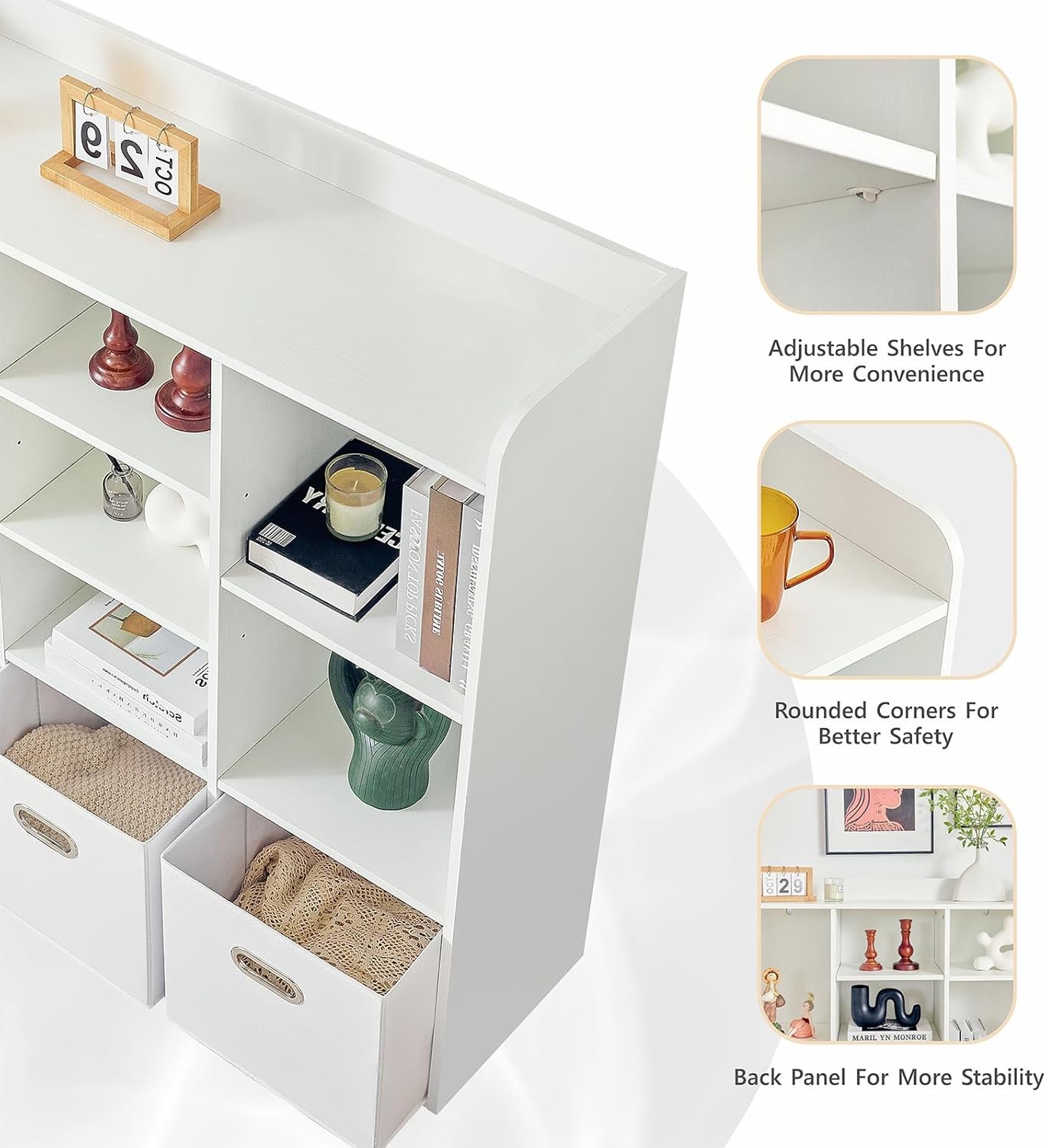 Product Description About this item Ample Storage Space: Designed with 7 open cubes in various sizes along with 3 storage bins, the cube bookshelf provides ample space to meet your diverse storage needs. It helps keep your room or office organized, reducing clutter and creating a more comfortable, tidy environment Multipurpose Bookshelf: With clean lines and pure colors, this cube storage organizer is both aesthetically pleasing and functional. In addition, it can be used not only as a bookshelf, but also as a display cabinet, filing cabinet and general storage cabinet, which can be placed in the bedroom, living room and office Sturdy and Safe: Built as a cube storage shelf with a thickened backboard instead of a thin one, this design enhances stability and prevents wobbling. Offering both strength and durability, it supports a high load-bearing capacity. An enclosed tabletop prevents small items from slipping, while rounded corners improve safety for daily use Easy Cleaning and Assembly: Move the shelves as desired to create different DIY combinations, and use the fixed stopper under the shelves to prevent them from sliding out. Each tier holds up to 33 lbs, with a total capacity of 300 lbs. Set up your own storage space quickly in just 30 minutes with this versatile white cube storage organizer Fashionable Dimensions: Overall dimension of the book shelf organizer: 42.52" wide x 13.19" deep x 44.49" high; minimalist, striking and timeless. The wooden cube bookcase rests directly on the floor without table legs, avoiding cleaning problems underneath and improving the visual stability of the product 7 Cubes White Wooden Bookcase for Home Office Workspace Two or More DIY Improves Space Utilization Carefully Designed Details & Durable Materials