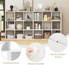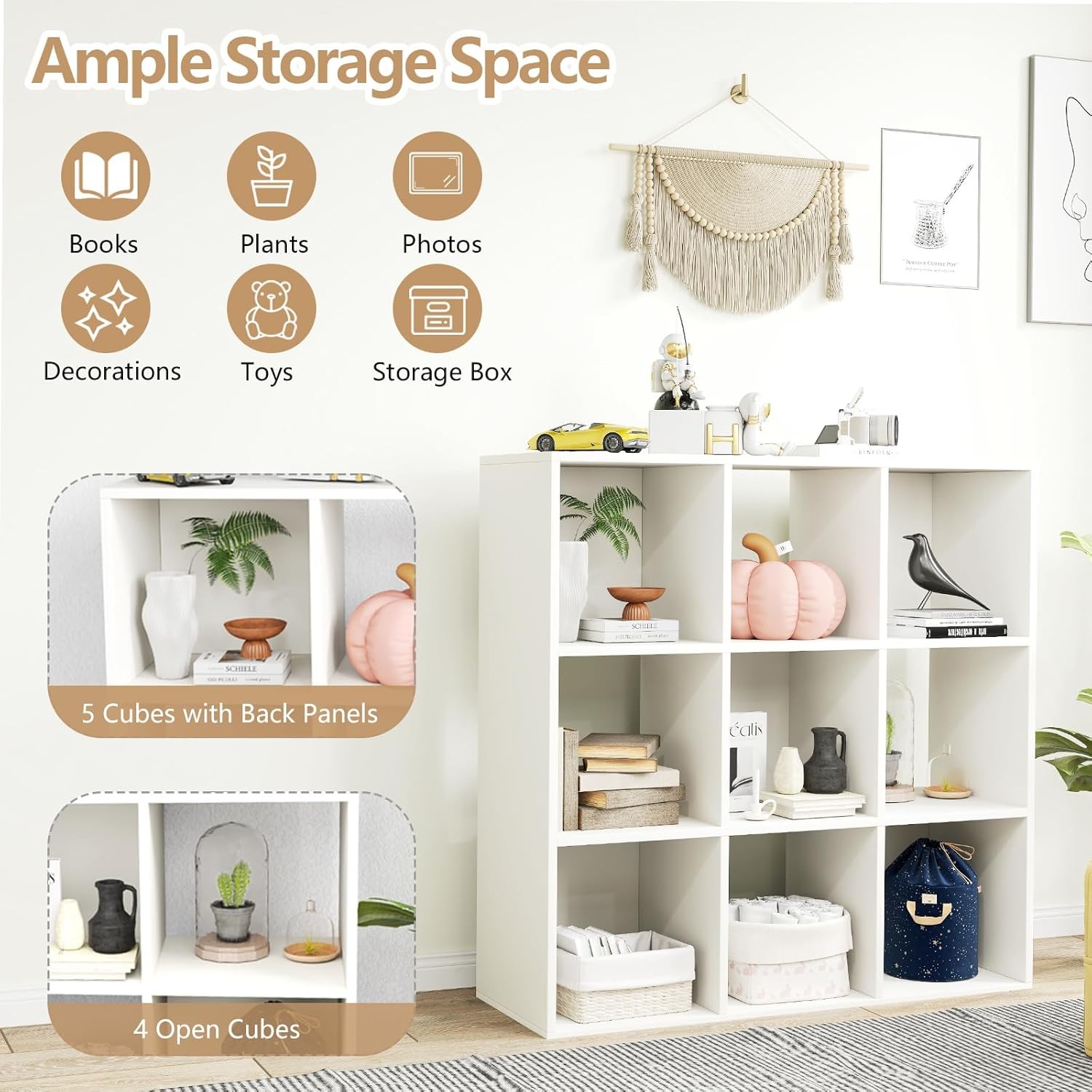 Product Description About this item 【Ample Storage Space】With 9 open shelves, this cubicle shelf provides abundant storage space for organizing your books or daily essentials. There are 5 cubes with back panels and 4 cubes fully open. You can classify your belongings flexibly in it. 【Perfect Fit for Small Spaces】Measuring 35.5’’ x 11.5’’ x 35.5’’(W x D x H), this cubical storage shelf is ideal for small spaces like apartments, dorms, or hallways. It can easily fit in any room corner or under a window. 【Premium Quality】Constructed with premium thickened boards, this bookshelf with storage is built to be strong and durable. It also includes anti-toppling devices and non-slip foot pads for added safety and stability during daily use. 【Effortless Assembly & Maintenance】With detailed instructions and clearly labeled parts, the assembly process is easy and hassle-free for the cube bookcase. And the smooth surface can be also easily cleaned with a damp cloth. 【Versatile and Stylish】Not only does this cubby shelving provide storage, but it also serves as a display for your potted plants, collections, or artworks. Its simple modern style makes it suitable for various occasions. Previous page Next page Specification Color White Material Engineered Wood, MDF Overall Dimension 35.5’’ x 11.5’’ x 35.5’’/91cm x 30cm x 91cm(W x D x H) Net Weight 49.7 lbs/22.5kg Weight Capacity of Top 155 lbs/70kg Weight Capacity of Each Cube 22 lbs/10kg Package Includes 1 x Cube Bookcase, 1 x Instruction On Aug 17, 2025 at 19:21:22 PDT, seller added the following information: