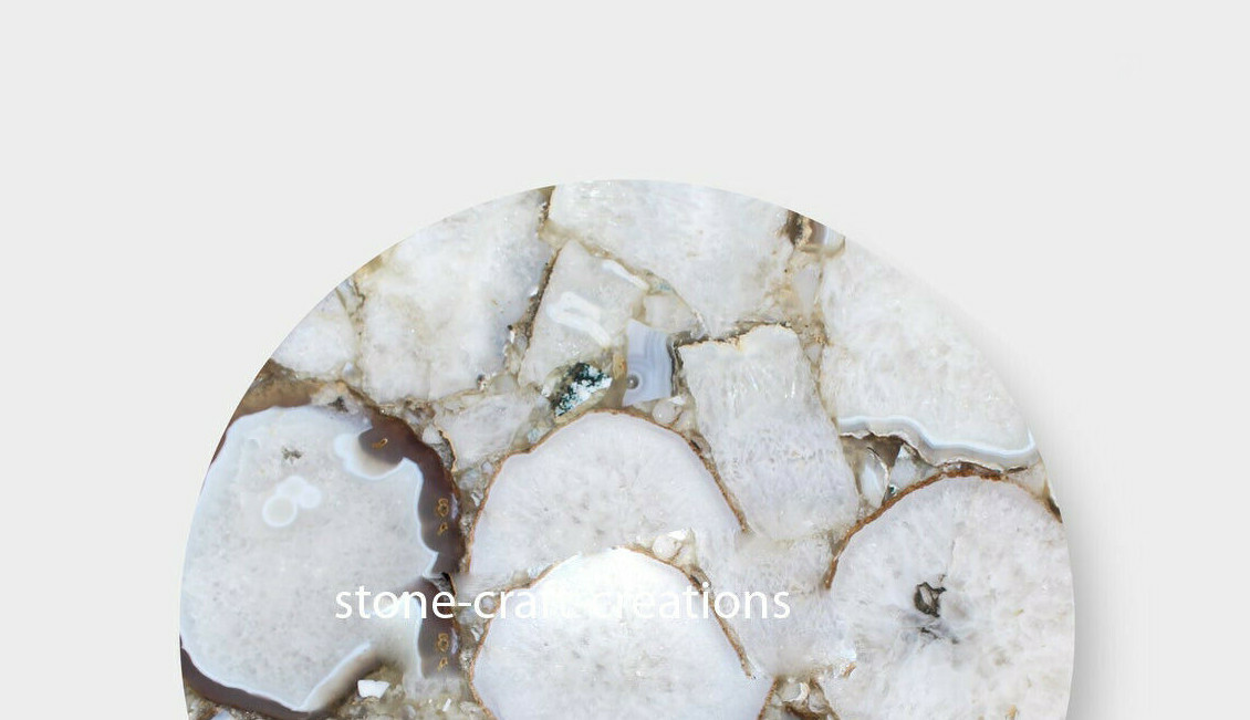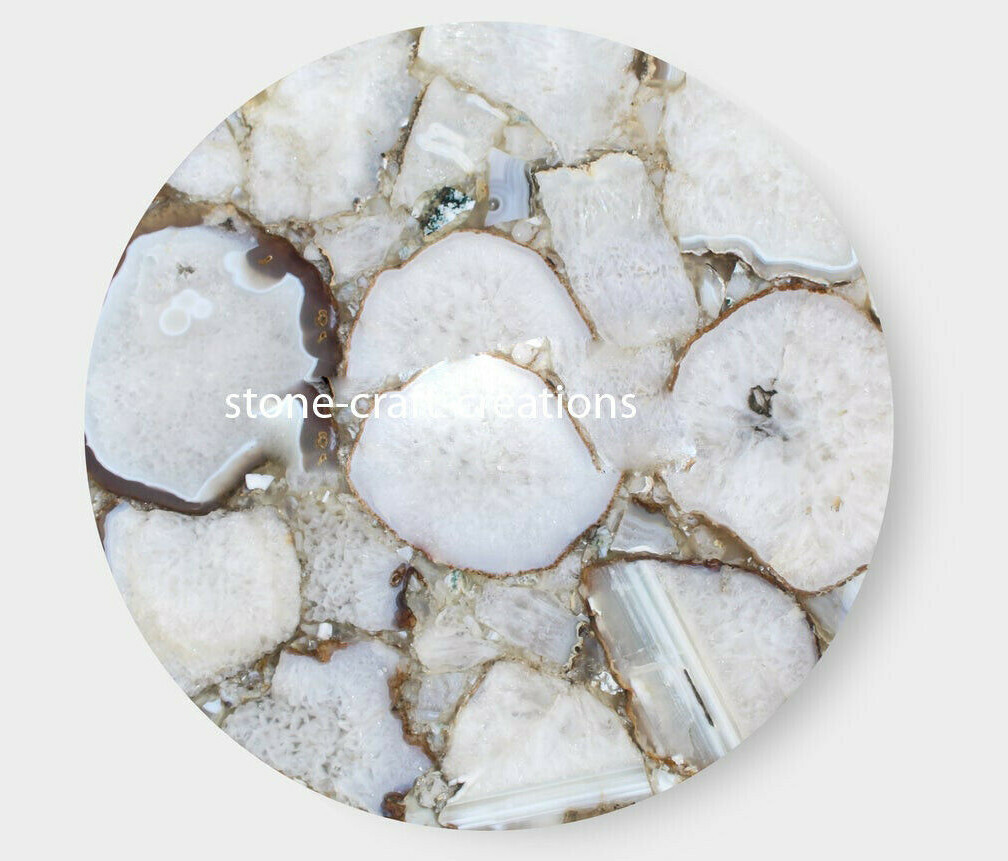 Welcome To Stone-Craft- Creations Shop Description Very unique Art by Indian Artist ,Coffee/Side Table top Used Material: Natural Agate Stones Arts Size: According to Size Variation Color: As Photo Shape: Round Pattern: Handmade Room: Bedroom, Dining Room, Hallway, Home Office/Study, Kid’s Bedroom, Kitchen, Laundry/Utility Room, Living Room,Patio, Playroom Packaging: Wood & Foam Export Packing Shipping: Air Can Be customize ,Please Message us your desired Size 1. It can be used as a Dining Table, Guest table, coffee table, center table top in show room as well as a gift for your loved ones. 2. The table top is made in Agra India & fully handmade. 3. The top will be delivered by FedEx or DHL free of cost door to door. 4. If there is any local tax,custom duties or Vat will be paid by the buyer at the destination. 5. The parcel is dispatch with proper packing & fully insured covering all kind of risk. 6. To maintain the table top is simple soap & water & dry cotton cloth. 7. If You Are Looking Something Customize, Let Us Know We Will Make For You As Per Your Design, Size & Shape. 8.Table top does not includes any wooden, marble stand or base if you like to buy marble or wooden base or stand that will be charged extra. Marble Agate Table Tops We are Manufacturer & Exporter of marble agate table tops. These marble agate table tops have different shapes like Round Table top, Octagonal Table Tops, Rectangle / Dining table tops, Square Table tops, Chess Table tops, Taj Mahal Table tops, Custom Designs Table tops also make marble Table top Base and Stand. Then we can be used as dining tables, coffee tables, Center tables, conference tables, chess boards, reading tables, bar tables , Garden table, side and corner tables or any other use as per the indoor and outdoor decor. They can also be placed outdoors in the garden, as marble is stain free, offers great resistance to the forces of nature, and can withstand heavy temperatures. We also meet customized requirement and offer our marble table tops at industry leading prices. About Agate Stone- Agate is a rock consisting primarily of cryptocrystalline silica, chiefly chalcedony, alternating with microgranular quartz. It is characterized by its fineness of grain and variety of color. Although agates may be found in various kinds of host rock, they are classically associated with volcanic rocks and can be common in certain metamorphic rocks. Ancient use of agate stone Agate is one of the most common materials used in the art of hardstone carving, and has been recovered at a number of ancient sites, indicating its widespread use in the ancient world; for example, archaeological recovery at the Knossos site on Crete illustrates its role in Bronze Age Minoan culture Types Of Agate 1. Fortification Agate This is the most common and distinctive type of agate. In these agates, bands crystallized into concentric layers that more or less follow the shape of the cavity. The banding resembles an aerial view of a fort 2. Water-Line Agate (also called water-level or onyx) During its formation, silica-rich solution either entered the cavity slowly laying one band at a time, excess water drained out leaving a small amount of silica to settle out into separate bands, or the vesicle filled under low pressure. In any case, the silica crystallization in water-level agates is controlled by gravity in one orientation, forming a stack up of parallel bands. 3. Shadow Agate Some agates exhibit a shadow effect in which there is what appears to be movement across the agate layers when the specimen is rocked back and forth (or your orientation to the specimen moves). This optical effect only occurs when there are alternating translucent and opaque bands. It is caused when light goes into the agate, but is not reflected out. 4. Tube Agate Tube Agate During the formation of some agates, parallel projections of tiny hair-thin mineral rods grow first within the silica gel, around which later the chalcedony agate micro-crystals form. In some cases the inclusions remain, but sometimes they weather away leaving hollow tubes that subsequently fill in with silica. 5. Eye Agates This mysterious agate characteristic is believed to be formed when most of the silica gel drains from the cavity, leaving only a droplet that “beads up” on the inside wall of the cavity. This droplet crystallizes into solid chalcedony “eyes”. In some cases, crystal growth will continue from this droplet in a manner similar to the formation of stalactites in caves. Later, the pocket fills in with the usual deposition of chalcedony microcrystals. 6. Plume Agate These agates initially had formations on their outside layer that formed prior to the deposition of chalcedony bands. They are filament growths of mineral inclusions that resemble ferns or feathers. 7. Geode Agate Geode Agate In some cases the supply of silica-rich water runs out before the entire cavity fills in. When there is a hollow center within a crystalline outer fill, the specimen is considered a geode. Not all geodes have agate banding, but many do. Also, the inner layers can form into several different types of silica mineral crystals and may even have other types of mineral crystals. 8. Moss Agate Moss Agate Moss agates have clusters of mineral inclusions that resemble plants, trees, or landscapes. Most moss agate inclusions are comprised of iron or manganese oxide. In some cases, the inclusions inhibit chalcedony banding allowing the mineral clusters free reign to grow within the silica gel. 9. Seam Agate Seam agates for in cracks within host rock, rather than in rounder pockets. The bands form in parallel rows that follow and fill in the crack or seam.