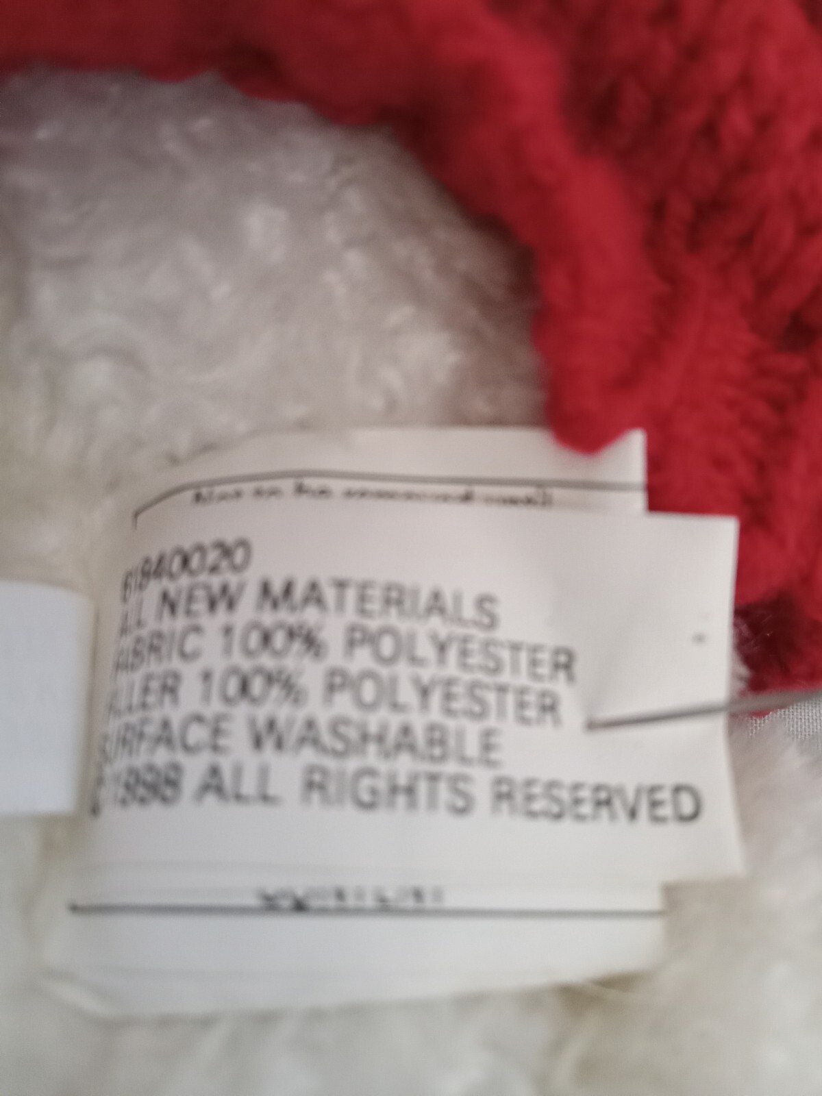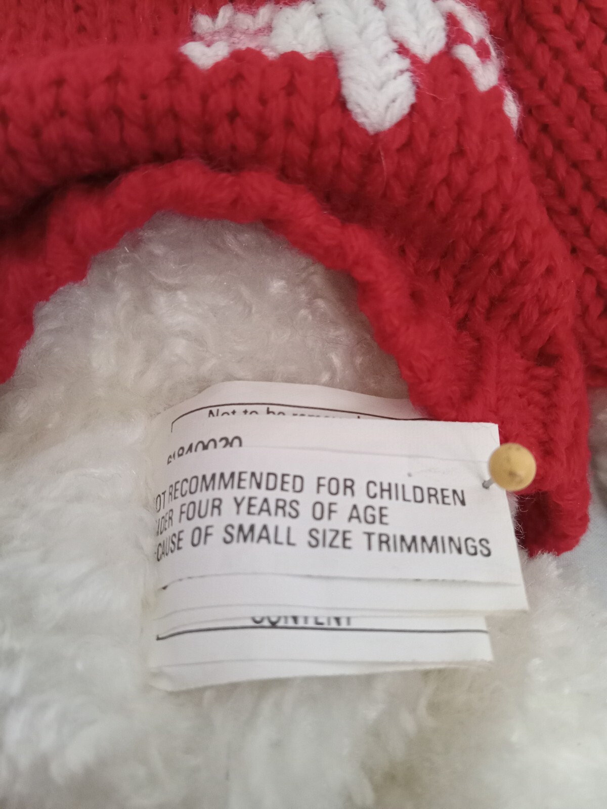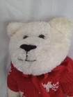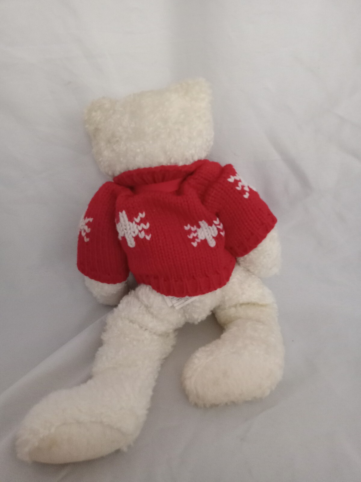 Cute clean white soft plush bear wearing a red knit sweater with snowflakes. 15 inch's long with weighted bottom and floppy legs. 1998 International Silver Co. stuffed animal. Embroidered mouth and nose. Very cuddly.