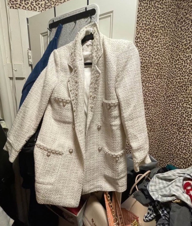 White Bouclé Double-Breasted Suit Jacket with Pearl Details, Women's Long Sleeve