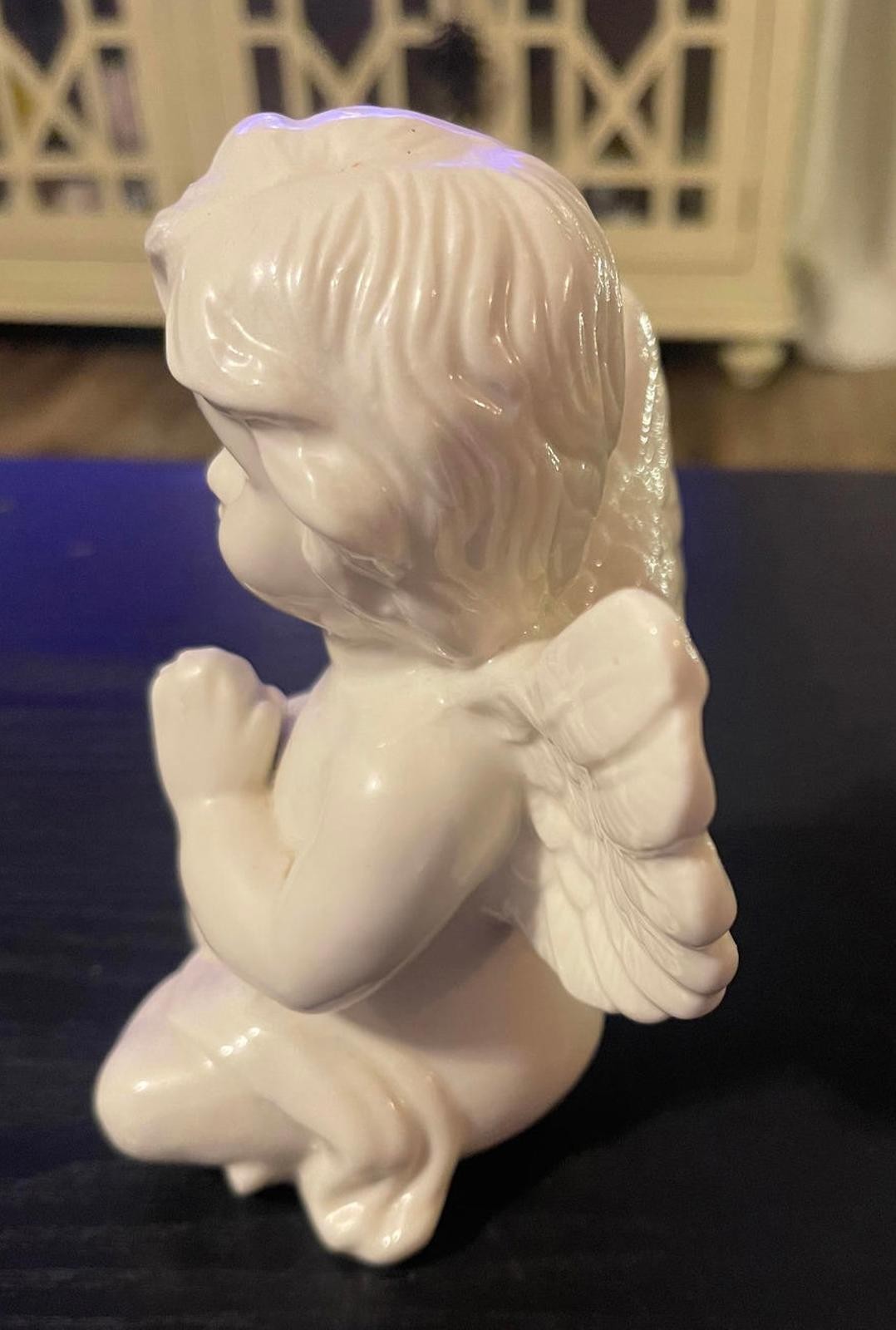 This white ceramic angel figurine features a serene design with detailed wings and praying hands.\nPerfect for home decor, spiritual spaces, or as a thoughtful gift.\nCompact size makes it easy to display on shelves, mantels, or desks.\nCrafted with smooth finish and delicate details for an elegant look.