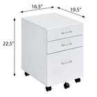 Specifications Place of Origin Taiwan, China Main Color White Main Material Wood+Metal Product Style Modern Cabinets Storage Quantity 3-4 Drawers Cabinets Features Drawers Included Use Case Office Cabinets Type Filing Cabinets Dangerous Goods #dangerFlag# Dimensions & Weights Assembled Length (in.) 16.50 Assembled Width (in.) 19.50 Assembled Height (in.) 22.50 Weight (lbs) 35.50 Product Features Modern file cabinet featuring a sleek and contemporary design, perfect for complementing your modern office or home décor Three spacious drawers provide ample storage space for organizing and storing your files, documents, and office supplies Caster wheels included for easy mobility, allowing you to move the file cabinet effortlessly around your workspace Boasts a sturdy top with a thickness of 15mm, ensuring durability and stability for various items placed on it. Description Romance Copy This modern file cabinet blends seamlessly with contemporary office or home decor, boasting a sleek design. Its three spacious drawers offer ample storage for files and supplies, while caster wheels ensure effortless mobility, enhancing convenience in your workspace. Product Details Set includes One (1) file cabinet Dimensions 22.5 inches high x 16.5 inches wide x 19.5 inches deep Materials