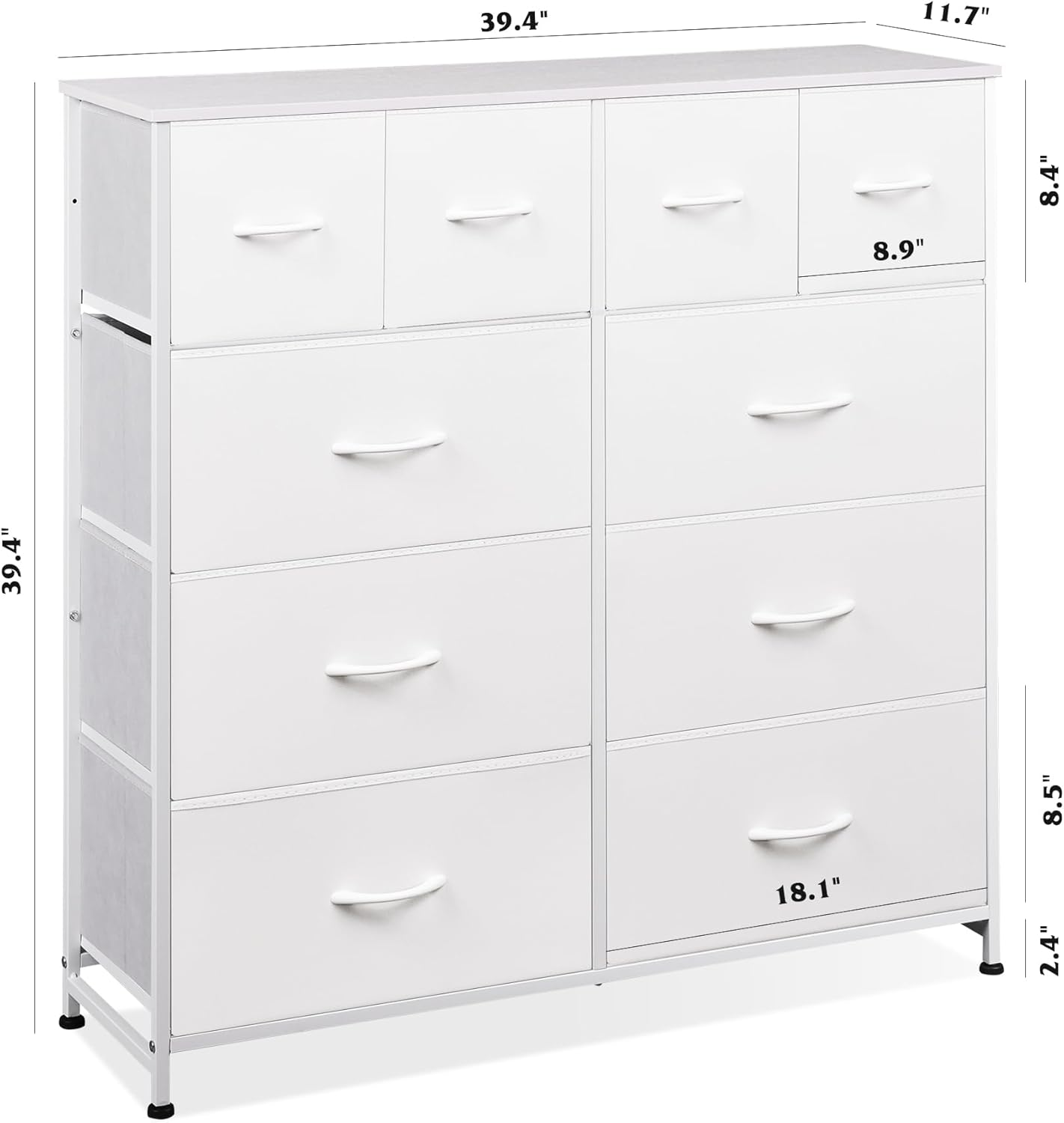 Multipurpose Dresser: Match perfectly with other WLIVE storage towers; This fabric dresser is ideal for bedroom, closet, living room, hallway, dorm and office. Roomy Storage Space: The 10 foldable deep drawers are spacious and provide endless organizational possibilities. Wooden top can place things you want to display or keep in reach, such as lamp, photos… Sturdy and Durable: The bedroom dresser can also be TV stand for small-size TV; With strong steel frame, water-resistant top and high-grade fabric drawers, the dresser is designed for a long service time. Exquisite Design: Easy pull handles help open and close the drawers smoothly; 4 adjustable feet can protect your floor from scratches and are designed for uneven ground. Overall Dimension: The wide chest of drawers measures 11.7"D x39.4"W x 39.4"H. The dresser for bedroom comes with detailed instructions and all hardware needed, it is easy to assemble. Product Description