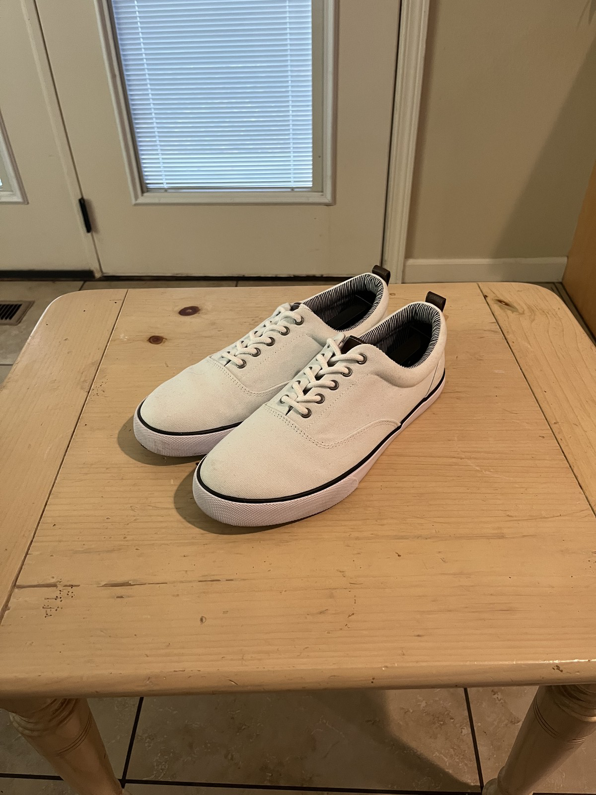 The product is a pair of white Goodfellow shoes in size 10. These casual men's shoes are perfect for everyday wear and are designed by the brand Goodfellow. The white color adds a clean and classic look to the overall style of the shoes, making them versatile for various outfits and occasions. With a comfortable fit and a durable construction, these shoes are a practical and stylish choice for any man's wardrobe.