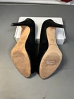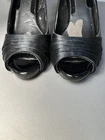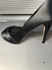 Elegant White House Black Market black satin peep-toe heels featuring a pleated toe, glossy patent heel, and leather outsole. A timeless dress shoe perfect for formal events, office wear, and evenings out. Condition: Fair pre-owned condition. Visible wear on insoles and scuffing on heel taps (see photos). Satin uppers still look good overall. Outsoles show normal wear. Structurally sound and great for someone who wants a stylish pair at a deal. Details: Brand: White House Black Market Size: 8M Color: Black Material: Satin upper, leather outsole Style: Peep-toe heels Patent stiletto heel Pleated front detail Classic dress/evening style Fast shipping with secure packaging!