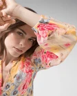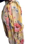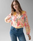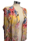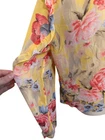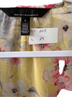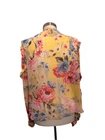 White House Black Market Ruffle Sleeve Blouse Cardigan. Excellent Used Condition. No holes, stains, fading, or pulling. The color is a pink, yellow, and blue floral design. This size is L. Bust (pit-to-pit) and length measurements are included within the photos. Measurements are approximate. Items come from a smoke free home!