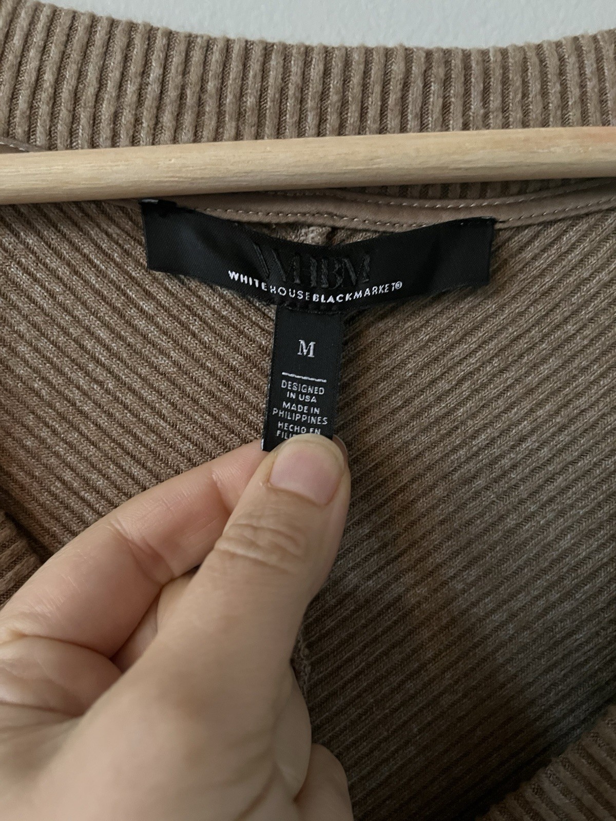 The White House Black Market Tan Ribbed V Neck Sweater in medium size is a classic and versatile addition to any woman's wardrobe. Made with soft knit polyester fabric, this pullover sweater features a flattering V-neckline and an oversized fit for added style and comfort. The rich brown color of the sweater makes it easy to pair with a variety of outfits, making it a must-have piece for any fashion-forward woman.