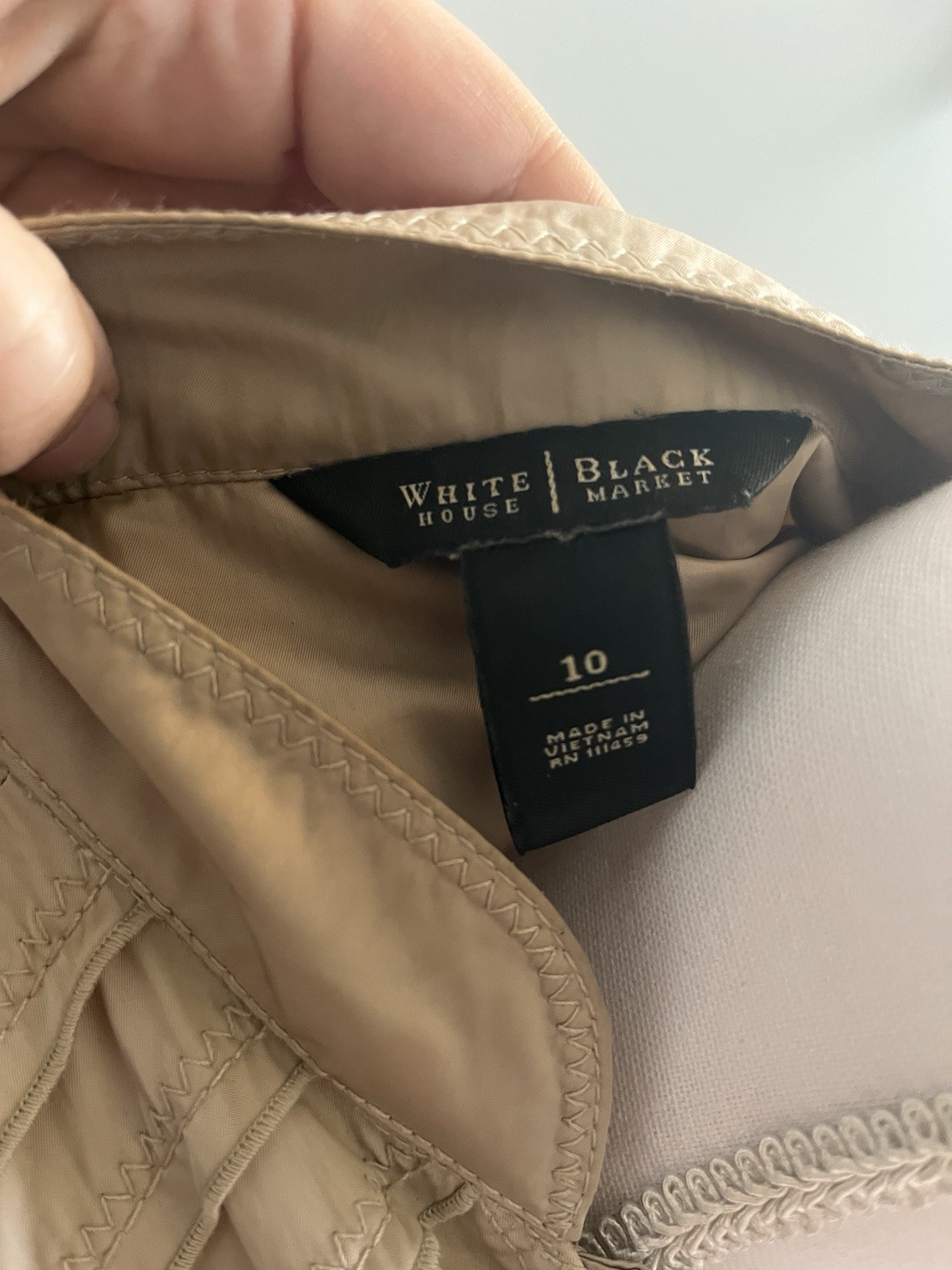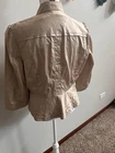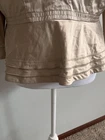 This Women's Beige Gold Ruffle Zip Front 3/4 Sleeve Jacket from White House Black Market is a stylish and versatile piece for your wardrobe. Made from a polyester blend outer shell and lined with polyester, this short jacket features a solid beige color with pleated and ruffle accents, a zip closure, and convenient pockets. Perfect for casual or workwear occasions, this jacket is a glam and classy addition to your outfit, adding a touch of designer luxury to your look. Ideal for all seasons, this jacket is a must-have for those who appreciate a blend of formal and boho styles.