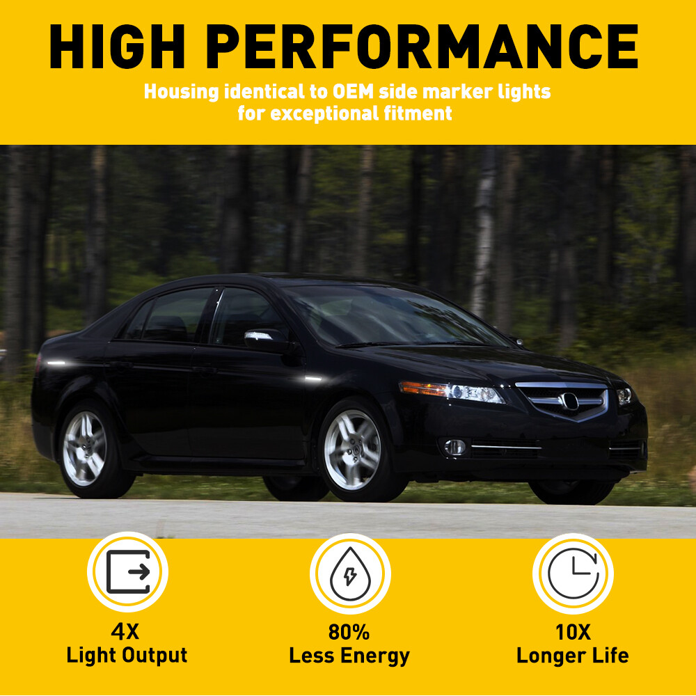 This page features 1Pair (2 Pieces) Smoked Lens White LED Front Bumper Side Marker Indicator Lights PLUS one pair (2 pieces) of white LED rear side marker lightsFor 2004-2008 Acura TL (Not compatible with 2007 & 2008 Type-S Models) These LED side marker lights are a great way to upgrade your car with superior lighting capabilities that looks great and is way safer. Error free, no On-board computer error, no FM interference Installation is plug and play with no modification required. ? ?Feature: White LED Front Rear Bumper Side Marker Indicator Lights For 04-08 Acura TL M This page features 1Pair (2 Pieces) Smoked Lens White LED Front Bumper Side Marker Indicator Lights PLUS one pair (2 pieces) of white LED rear side marker lights For 2004-2008 Acura TL (Not compatible with 2007 & 2008 Type-S Models) These LED side marker lights are a great way to upgrade your car with superior lighting capabilities that looks great and is way safer. Error free, no On-board computer error, no FM interference Installation is plug and play with no modification required. ? ?Feature: 100% Brand new and quality Smoked lens Color: White (FRONT) & White (REAR) Good for 2004-2008 Acura TL (Not compatible with 2007 & 2008 Type-S Models) OEM Part Number#: 33850-SEP-A01 33655-SEP-A01 33800-SEP-A01 33650-SEP-A01 Powered with super bright white LED lights inside for front & rear side marker lamps Simple Plug N' Play : Direct Replacement, No Modification Required DOT SAE approved Replace the original amber & red lens to a more modern and smoked sport style Great way to upgrade your car with better lighting capabilities ? ?Specification: T ype of Lights: LED front & rear side marker lights/fender flare lamps Material: Durable Black ABS Housing Waterproof: IP67 Lens color: Smoked Light color: White (FRONT) & White (REAR) Installation position: Front & Rear Side Marker Lamps Ultrasonically sealed Work Temperature:-40 - 60 centigrade degree Voltage:12-24V DC; Power: 4W L ow power consumption; Quick Instant Start-Up time ? ?Fit for: For 2004-2008 Acura TL Not compatible with 2007 & 2008 Type-S Models Please make sure you have available space in your car for these lights to fit before placing order. ?Package included: 2pcs White LED Front Side Marker Parking Lights 2pcs White LED Front Side Marker Parking Lights ? ?Installation: Direct replacement, plug and play with no modification needed Note: Professional installation is highly recommended! ABOUT US White LED Front Rear Bumper Side Marker Indicator Lights For 04-08 Acura TL M This page features 1Pair (2 Pieces) Smoked Lens White LED Front Bumper Side Marker Indicator Lights PLUS one pair (2 pieces) of white LED rear side marker lights For 2004-2008 Acura TL (Not compatible with 2007 & 2008 Type-S Models) These LED side marker lights are a great way to upgrade your car with superior lighting capabilities that looks great and is way safer. Error free, no On-board computer error, no FM interference Installation is plug and play with no modification required. ? ?Feature: 100% Brand new and quality Smoked lens Color: White (FRONT) & White (REAR) Good for 2004-2008 Acura TL (Not compatible with 2007 & 2008 Type-S Models) OEM Part Number#: 33850-SEP-A01 33655-SEP-A01 33800-SEP-A01 33650-SEP-A01 Powered with super bright white LED lights inside for front & rear side marker lamps Simple Plug N' Play : Direct Replacement, No Modification Required DOT SAE approved Replace the original amber & red lens to a more modern and smoked sport style Great way to upgrade your car with better lighting capabilities ? ?Specification: T ype of Lights: LED front & rear side marker lights/fender flare lamps Material: Durable Black ABS Housing Waterproof: IP67 Lens color: Smoked Light color: White (FRONT) & White (REAR) Installation position: Front & Rear Side Marker Lamps Ultrasonically sealed Work Temperature:-40 - 60 centigrade degree Voltage:12-24V DC; Power: 4W L ow power consumption; Quick Instant Start-Up time ? ?Fit for: For 2004-2008 Acura TL Not compatible with 2007 & 2008 Type-S Models Please make sure you have available space in your car for these lights to fit before placing order. ?Package included: 2pcs White LED Front Side Marker Parking Lights 2pcs White LED Front Side Marker Parking Lights ? ?Installation: Direct replacement, plug and play with no modification needed Note: Professional installation is highly recommended! FAQ Shipping Returns Contact Us Payment Why swith to LED? LEDs not only give your vehicle a clean, modern look but, with proper use, will outlast any halogen bulb and HID bulb! Low energy draw, high lumen output, and instant on/off LED technology out shines stock bulbs in every way. Which bulbs are used in my vehicle? Check Sylvania automotive lamp replacemnt guide , you can select the year, make, and model of your vehicle, then select the application you want to replace or upgrade from stock. What does CAN Bus mean? CAN Bus means Controller Area Network Bus. This system monitors your vehicle and reports operating conditions. CAN Bus systems are commonly found in European vehicles such as BMW, Audi, Mercedes, Volkswagen, Porsche, and in many American vehicles. While most late model American vehicles have CAN Bus systems, it is always good to check with your vehicle dealer to see which system your vehicle has before purchasing electrical products. When do you need Warning Canceller? Some vehicles with cmplex internal computers(such as Audi,BMW,Jaguar,Mercedes,etc.) might report on-dash errors or flickering on the headlights. The warning canceller fixes the dashboard warning and flickering effect. Bulb Out Dashboard Error: On some vehicles, the dashboard will report as if you have a headlight bulb missing or burnt. It does not affect the headlights functioning, but the light on-dash will be on. The warning canceller fixes the issue. Flickering Issue: This happens when your vehicle does not recognize the new headlights installed. When turning the headlights on, the ve