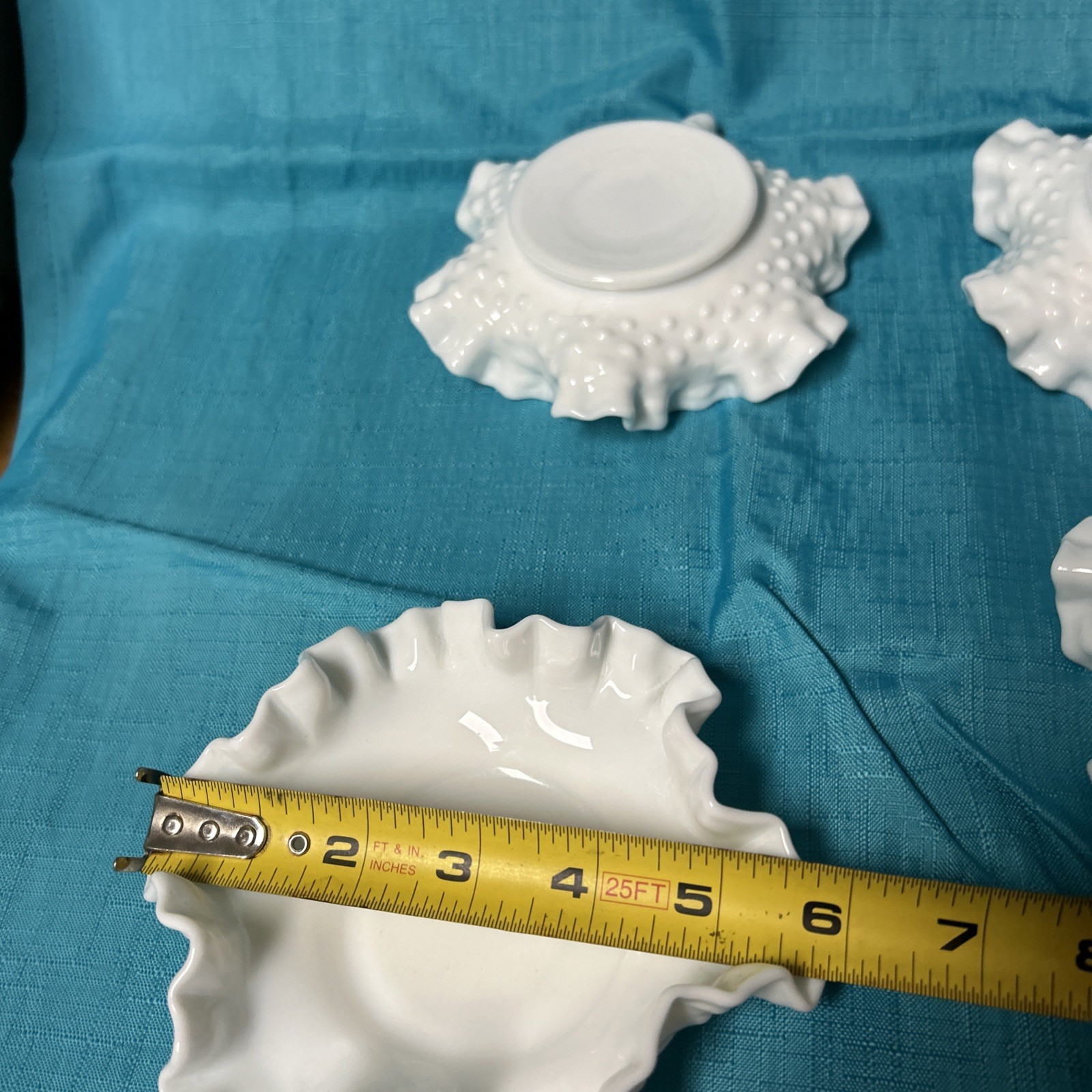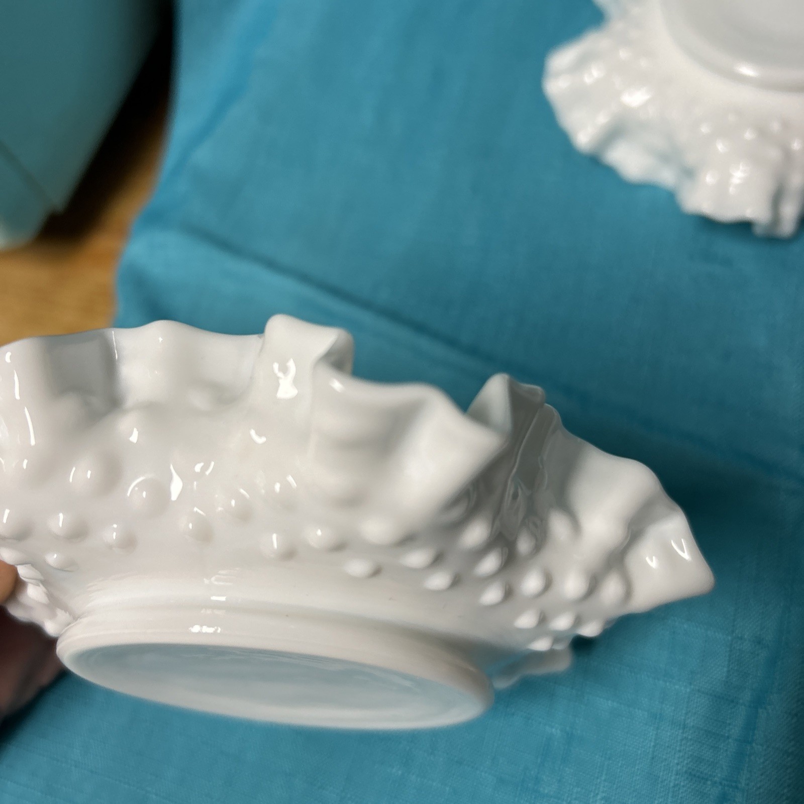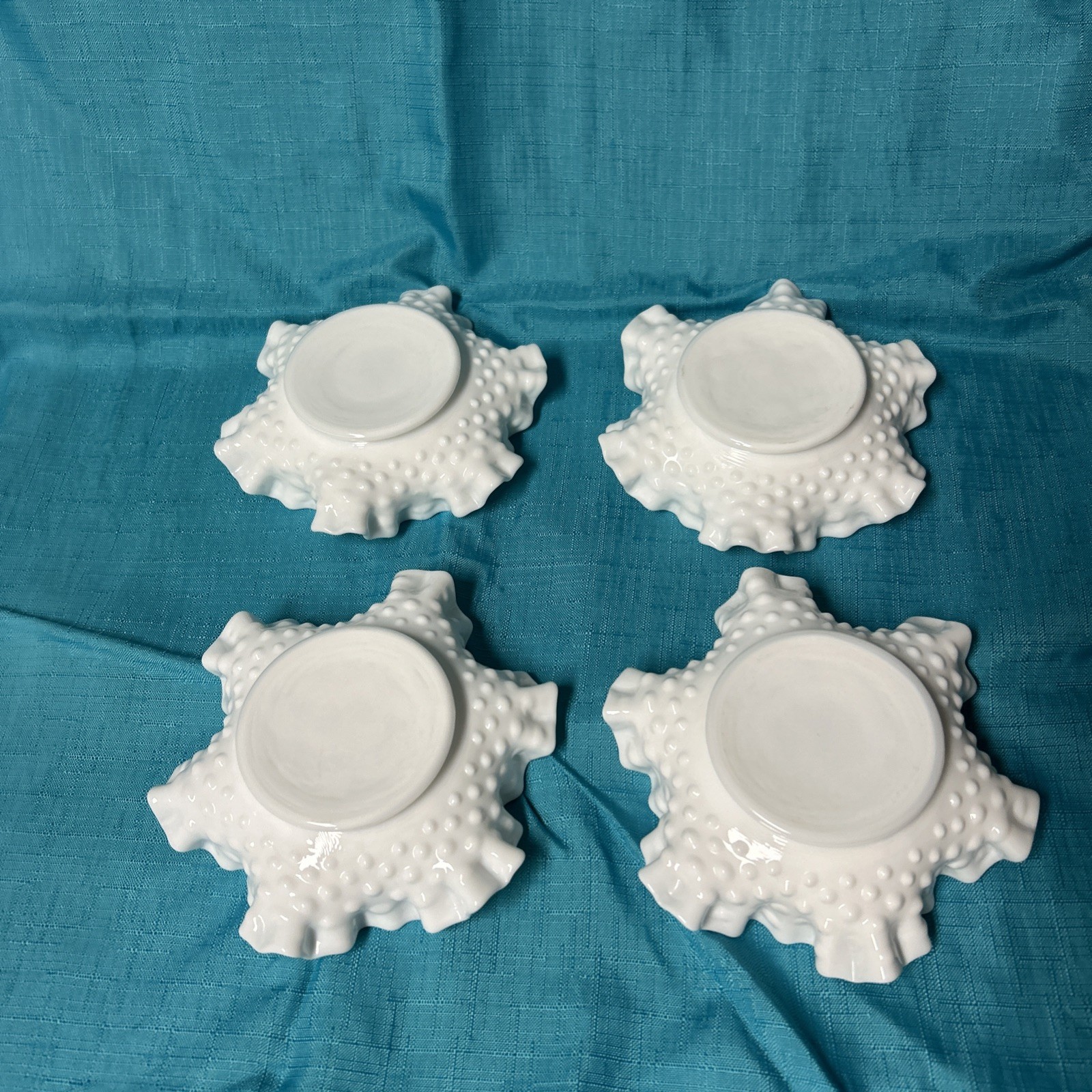 This set of 4 vintage white milk glass hobnail ruffled bowls is perfect for all occasions. Made in the United States during the mid 20th century, these decorative bowls feature a glossy finish and a unique fused glass production technique. The unmarked brand and original design add to the charm of these elegant and stylish pieces, making them a beautiful addition to any adult's home decor.