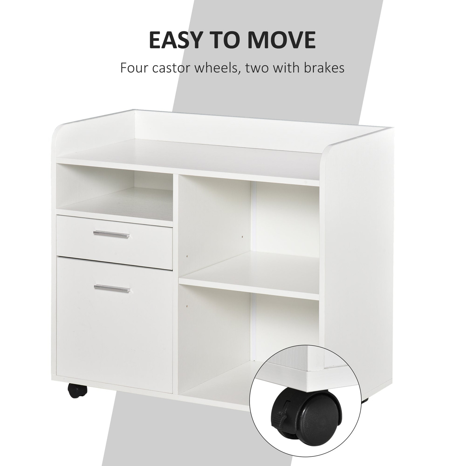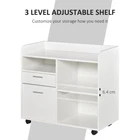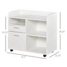 Specifications Place of Origin China Main Color White Main Material Particle Board Dangerous Goods #dangerFlag# Dimensions & Weights Assembled Length (in.) 31.50 Assembled Width (in.) 15.80 Assembled Height (in.) 28.30 Weight (lbs) 58.40 Product Features Practical Office Helper: This filing cabinet has both open storage spaces and file drawers, designed to keep files, paper, and office machines like your printer, scanner, computer organized. Large Storage Space: Our drawer desk organizer has plenty of storage options: right open shelf with adjustable shelving, two drawers, a small open shelf, and surface space. Adjustable Shelf: The right shelf of this office file cabinet is movable and can be adjusted in 3 levels up and down. With each level 2.5'', you can change the cabinet inner space to meet your personal needs. Moves Anywhere: With four 360° smooth-rolling caster wheels, the printer cabinet can be easily moved to where you need it in your home. The brakes on two of the wheels help secure the office cabinet in place and add stability. Filing Cabinet Information: Overall Dimensions: 31.5' W x 15.75' D x 28.25' H, Overall Weight Capacity: 88 lbs. (total), 6.6 lbs. (drawer), 11 lbs. (each shelf). Description