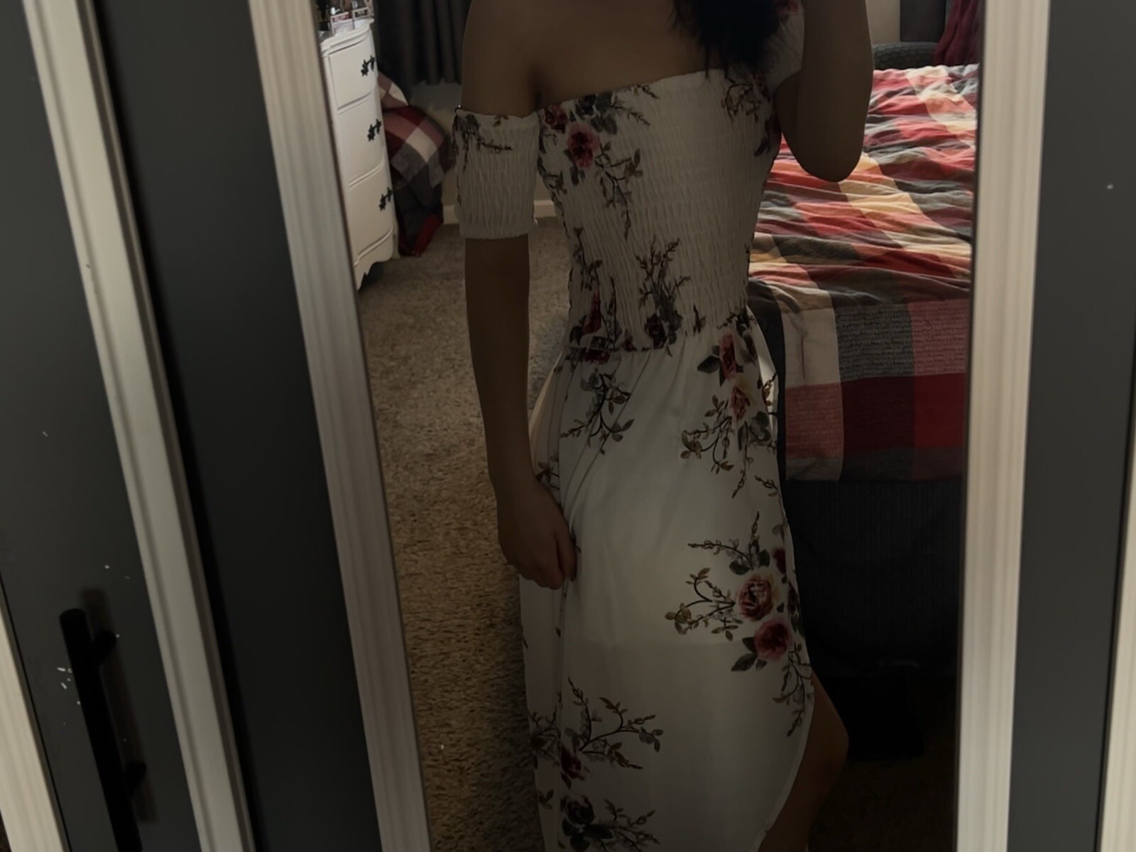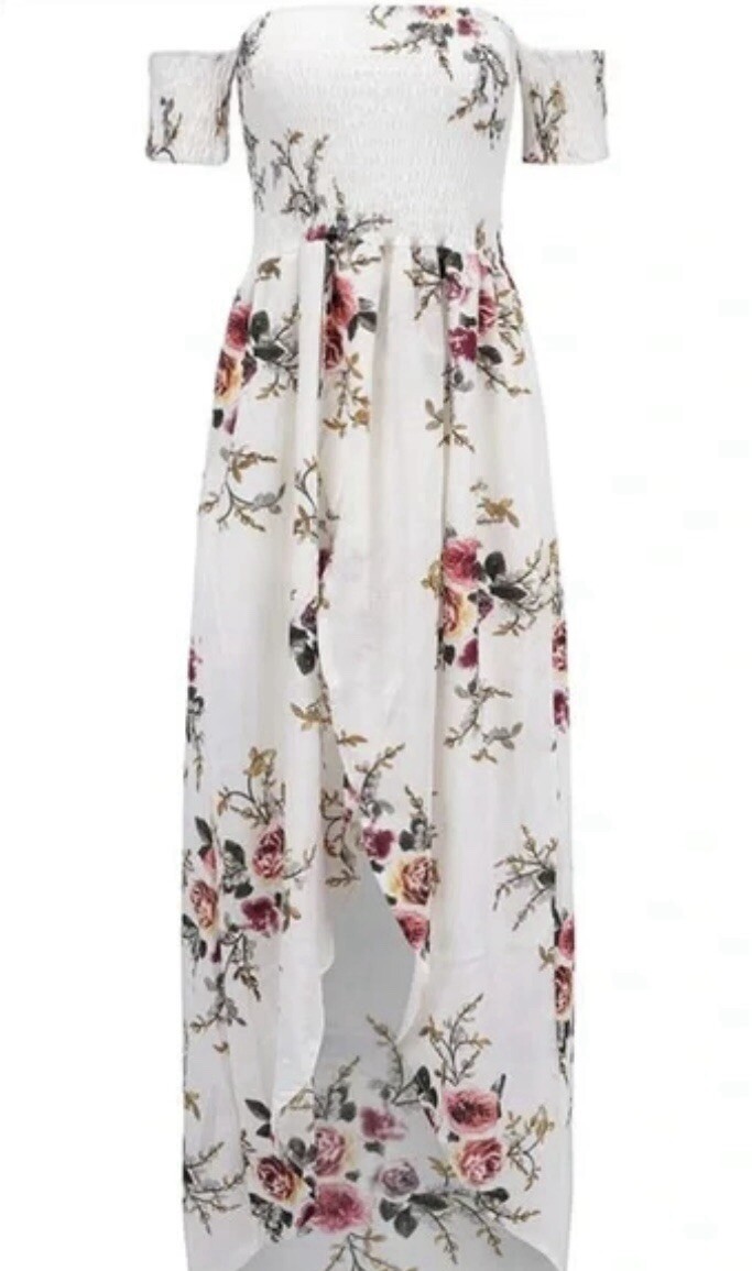 This beautiful white sundress is perfect for any occasion. The off the shoulder neckline and floral pattern give it a feminine and effortless look. The dress features an open front, adding a touch of allure to the overall design. The brand is Flowers, and it's made for women who want to feel confident and stylish. The dress is made with high-quality materials and has a comfortable fit that will make you feel amazing all day long. Its simple yet elegant style is perfect for a day out with friends or a romantic evening. Get your hands on this stunning dress today and show off your sense of style.
