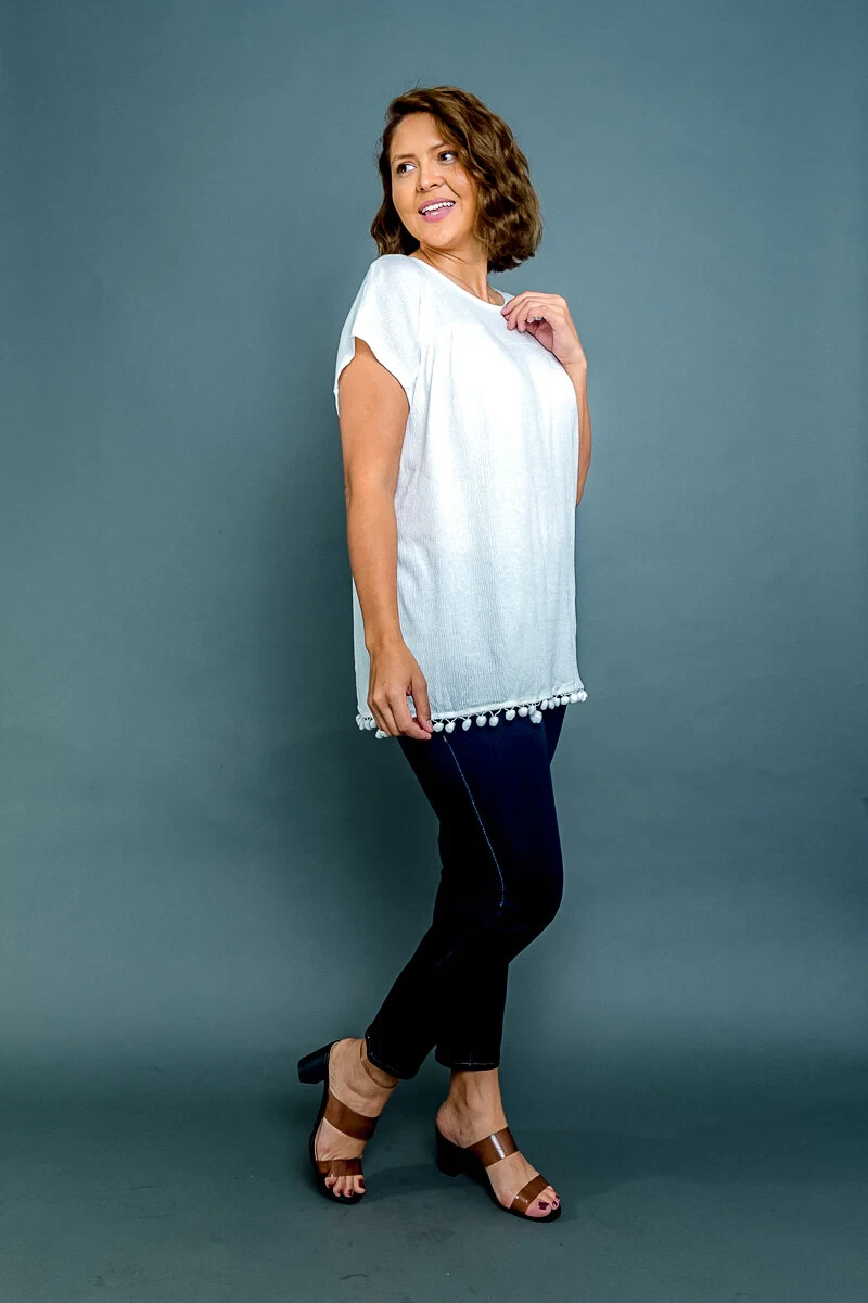 This white short sleeve top has an embroidered purple roses applique. The fabric is soft thick crepe. It is a cotton blend and machine wash and dry. It is a Womens Plus size 1X. I also have this listed in sizes 2X & 3 X. It measures 26" from one underarm seam to the other, the bottom measures 27 1/2" acro ss, and the length from the top of the shoulder down measures 28 1/2". For a great fit I recommend comparing my measurements to something similar that you have that fits you comfortably. T16