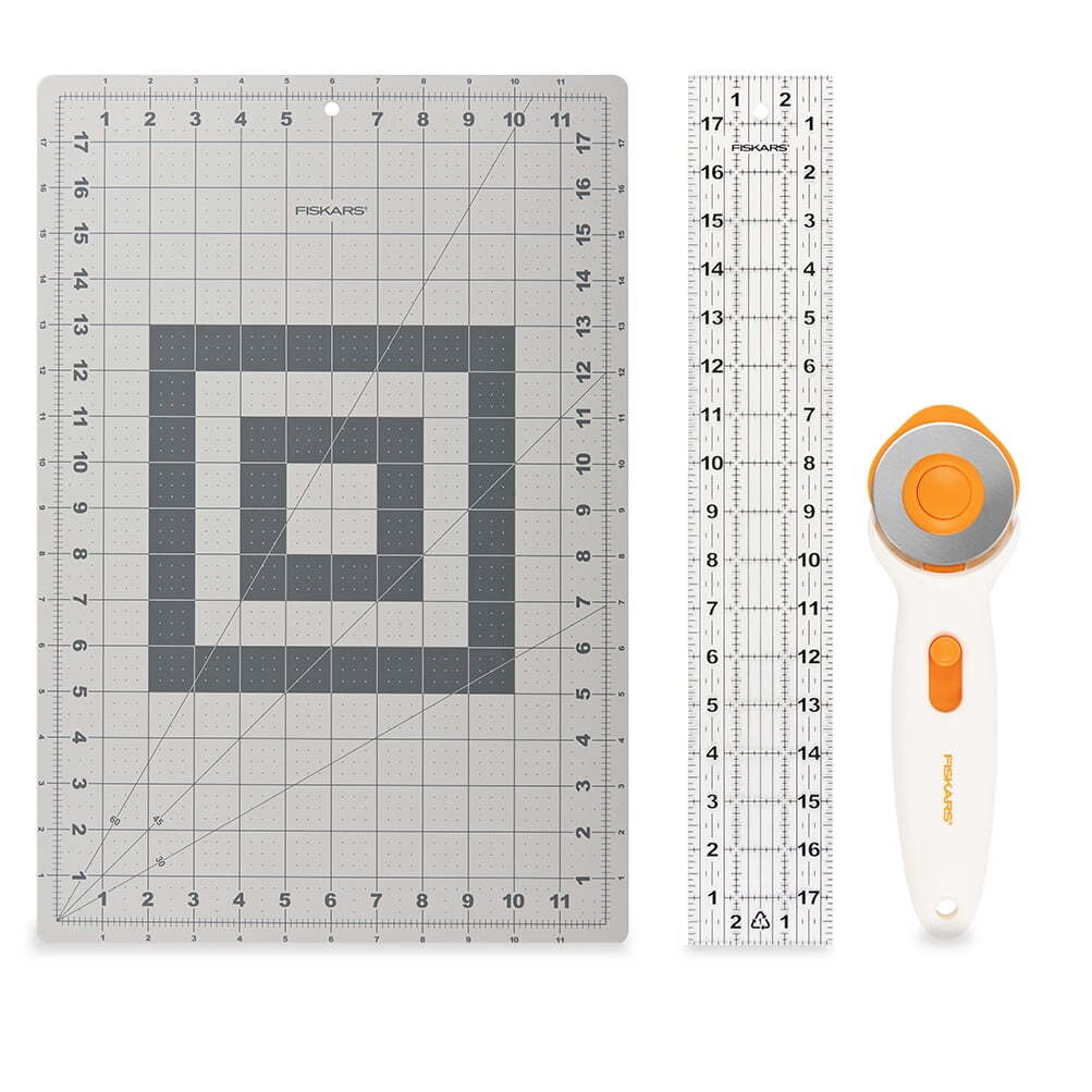 Happiness is your wild idea taking shape with Fabric Cutting Set. This 3-piece set offers the perfect combination of tools for basic sewing and quilting tasks like taking precise measurements and making long cuts. The Stick Rotary Cutter features a 45 mm blade perfect for cutting multiple layers of fabric with high-grade, precision ground, premium steel that holds its sharp edge. The cutter has a symmetrical design for both left- and right-handed users. A self-healing 18 in x 12 in Cutting Mat features easy-to-read numbers and grid lines and is double sided for long-lasting use. The Cutting Mat’s 30-, 45- and 60-degree bias lines aid in cutting triangles and other shapes. A clear, durable 3 in x 18 in Sewing Ruler has black and white markings for visibility on light and dark materials. ROTARY FABRIC CUTTER: High-grade, precision-ground, 45mm rotary blade is perfect for projects and fabric that require precise cutting; Ideal for cutting multiple layers of fabric, paper, felt, and vinyl SELF-HEALING CUTTING MAT: Cutting mat protects surfaces for sewing and other projects, with self-healing surface, easy-to-read measuring grids, and 30, 45, and 60-degree bias lines that make angle cutting easy SEWING AND QUILTING RULER: Large clear ruler for precise measurement, with highlighted seam allowances, easy-to-read measurement lines, and 30, 45, and 60-degree line indicators for easier angle cutting LONG LASTING AND RELIABLE: Self-healing mat surface lasts longer than other craft cutting mats; craft supplies and materials are built to last QUALITY TOOLS FOR ARTS AND CRAFTS: From scissors and cutting mats, rotary and paper cutters, to classroom essentials, scissors for kids, and quilting and scrapbooking supplies, crafting tools are designed to help you do what you do best: express yourself Classic Stick Rotary Cutter features a rolling 45 mm blade that cuts multiple layers and holds fabric flat for accurate, straight cuts without jagged edges Extra-large 18 x 24 inch Cutting Mat features an easy-to-read measuring grid and a self-healing, double-sided surface for lasting value