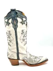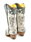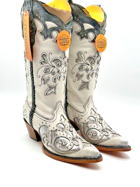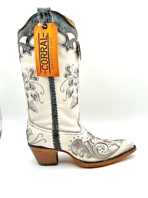 Corral Ladies White & Silver C3935 Embroidered Crystal Studded LeatherBoots 6.5 Medium Style number: C3935. White and silver full grain leather foot and upper. Floral Embroidery on shaft with silver inlay. Crystals woven throughout. Pull tabs. Leather lining. Point toe. 2 inch cowboy heel. Good year welt. Leather sole