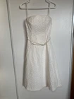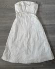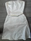 Belt slightly off color, white dress was washed and pre-treated for any stains but may have tiny unnoticeable spots This beautiful white strapless dress from Express is a perfect addition to any wardrobe. With a midi length and fit & flare style, it's ideal for any occasion from travel to weddings. The dress features delicate lace and floral patterns, making it perfect for a classic, retro, or bohemian look. The dress is made from a combination of polyester and cotton, and is machine washable for easy care. It comes in size 4 and is designed for regular size types. The square neckline and sleeveless design make it perfect for warmer weather, while the belted feature and zipper closure provide a flattering fit. This dress is sure to make anyone feel confident and stylish.