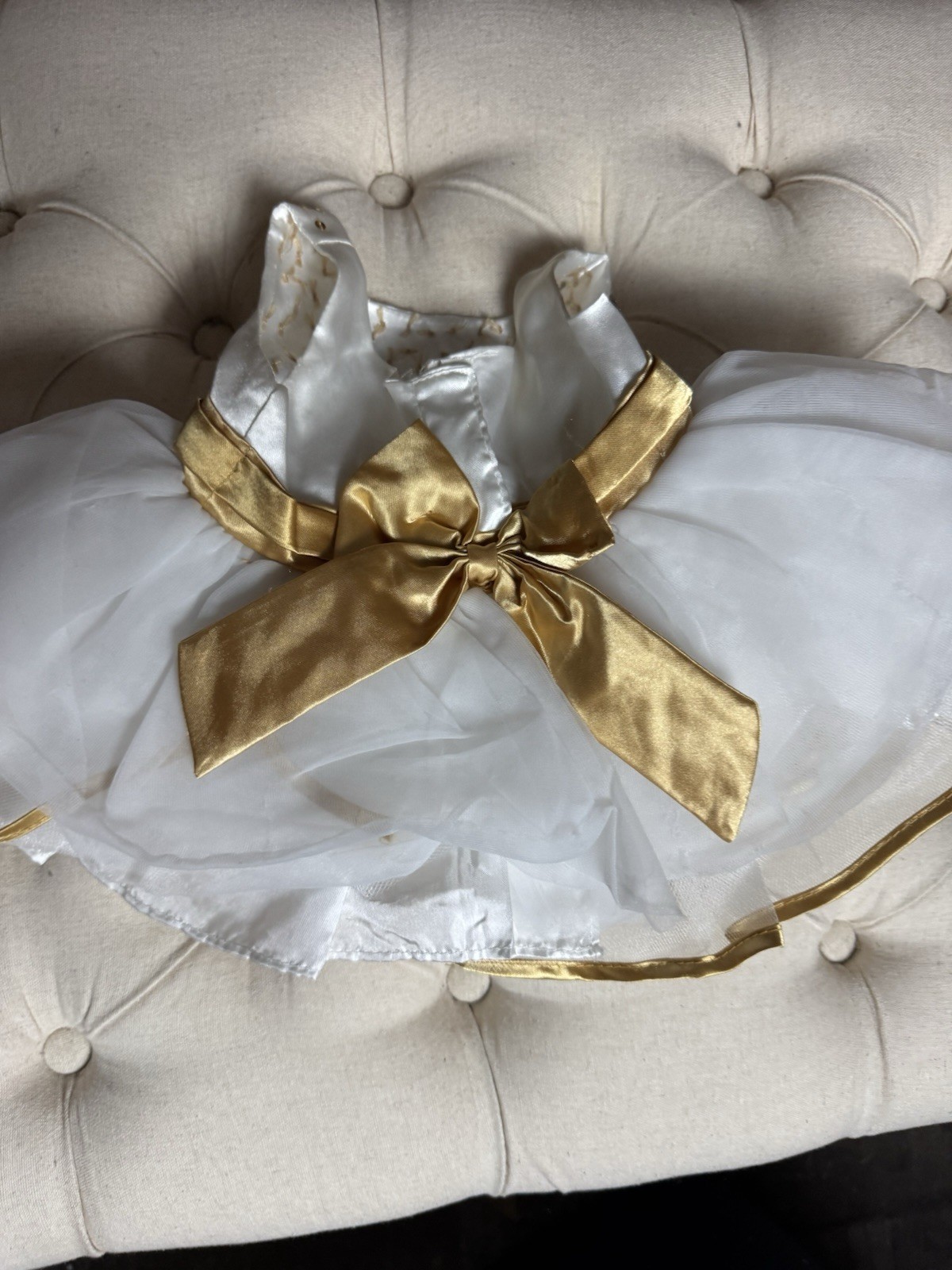 Dress up your beloved Build-A-Bear with this gorgeous white tiered dress, adorned with eye-catching gold sequins that capture the light and add a touch of sparkle to any collection. Ideal for special occasions, this charming outfit is a perfect addition to your bear's wardrobe, showcasing a classic color combination that's both elegant and playful. Crafted from quality cloth material, the dress is designed to fit most Build-A-Bear Workshop animals, ensuring a comfortable fit for your furry friend. This retired piece is a must-have for collectors and bear enthusiasts alike, suitable for ages 3 and up. Add this timeless piece to your collection and watch your bear strut in style.