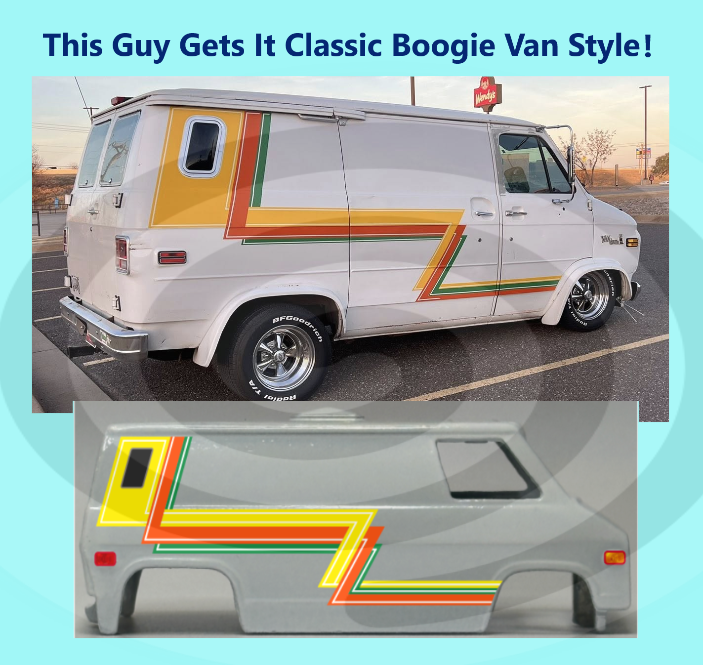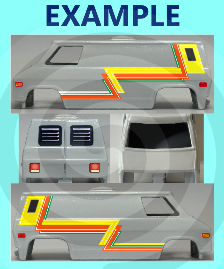 White Toner 1:64 Waterslide Decal for Super Van Classic Boogie Van Stripes - (1 Set) Get that Classic Boogie Van Style! This is a custom aftermarket decal I created so you can customize and enhance the looks of your beloved diecast cars, models, or slot cars. This decal is "compatible with" a Hot Wheels Super Van . I t may work on other cars or brands with a little imagination. Have some fun, get a good laugh, enjoy the custom diecast hobby! I try to fill my decal sets with as many decals as possible to maximize the value to you - a steady hand, patience, & sharp scissors are required. If a car is shown it is an example only and not included but it shows the possibilities for the waterslide. This decal WILL work on dark colors. No Need to clear coat the decals before applying the decal SHIPPING Ebay gives an “estimated” delivery date. With U.S. Mail it can take a few weeks- up to (14 days) to arrive - please be patient. If you want special expedited shipping. Please contact me and I will invoice. If you're not happy with your decals for any reason, take a picture of the issue and don’t toss the unused portion. Please contact me - let me try to make it right.