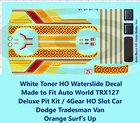 White Toner HO Waterslide Decal, Made to Fit Auto World TRX127, Deluxe Pit Kit / 4Gear HO Slot Car, Dodge Tradesman Van, Orange Surf's Up This is a custom aftermarket decal I created so you can customize and enhance the looks of your beloved diecast cars, models, or slot cars. This decal is "compatible with" an Auto World TRX127 Deluxe Pit Kit 1977 Dodge Tradesman Van 4Gear HO Slot Car Kit . It may work on other cars or brands with a little imagination. Have some fun, get a good laugh, enjoy the custom diecast hobby! I try to fill my decal sets with as many decals as possible to maximize the value to you - a steady hand, patience, & sharp scissors are required. If a car is shown it is an example only and not included but it shows the possibilities for the waterslide. This decal WILL work on dark colors. No Need to clear coat the decals before applying the decal SHIPPING To keep costs down - I mail your decals with an envelope and a stamp. Ebay gives an “estimated” delivery date. With U.S. Mail it can take a few weeks (14 days) to arrive - please be patient. If you want special shipping. Please contact me and I will invoice. Tracking number with USPS First-Class Package + $3.20 If you're not happy with your decals for some reason, take a picture of the issue and don’t toss the unused portion. Please contact me - let me try to make it right.