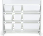 Plastic Removable toy storage bins for playtime and easy clean up. Sturdy engineered wood construction frame reinforced with steel dowels, 20 pound weight capacity per level. 9 durable and interchangeable plastic storage bins, 6 standard and 3 large sized. BPA and phthalate free. Neutral white wooden finish with white colored toy bins and top storage shelf Stabilizing braces provide additional safety support. Assembly required. Includes all hardware. For ages 3+ Playtime is more fun when your kids can easily take out their toys, books and games and then quickly clean up afterwards. The space-saving Humble Crew Toy Storage Organizer with Shelf and 9 Storage Bins stows your children's toys in easy-to-see, easy-to-access BPA and phthalate free plastic storage bins. 6 standard and 3 large storage containers are easy to remove, replace and reposition along the 3 tiered shelves—sized just right within the toy organizer for toddlers and preschool-aged children. The top ledge on this kid's storage unit is the perfect space to display books, dolls or other favorite small toys, pictures and other decorative items, providing an additional level of easy-to-see and easy-to-access open storage for your convenience. It makes a great toy box storage alternative, helping keep your little one’s room clean and organized while at the same time teaching sorting and cognitive skills. The stylish all white wood finish and storage bins make this the perfect organizational solution for bedrooms, nurseries, playrooms and classrooms. Made with a sturdy engineered wood construction frame and steel shelving rods, each level can hold up to 20 pounds. Some assembly is required and all hardware is included. Product sizing – 34"W x 11"D (16"D with stabilizing braces) x 31"H Standard bin sizing: 12"L x 9"W x 6"H Large bin sizing: 16"L x 12"W x 6"H Additional plastic storage toy bins are also sold separately.