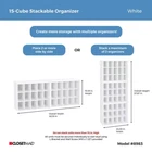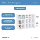 Stackable 15-Cube Organizer with Laminate Finish Hardware and assembly instructions included Cube shelves measure 5.75 in. H x 4.5 in. W x 11 in. D Create more storage options in your home or office with the ClosetMaid 15-Cube Organizer. You can leave it freestanding or stack it with others for higher capacity. Customizable configuration allows you to meet your specific needs. Perfect for storing shoes, the organizer has a smooth, white finish that goes with the decor of every room in your home. Its assembled dimensions are 19 in. H x 25 in. W x 11-5/8 in. D. Weight capacity of 30 lbs. (when evenly distributed) Constructed with laminate material that is durable and adds a contemporary feel Fifteen 6 in. H x 4-1/2 in. W cubes hold a variety of items Stackable for maximum use of vertical space Includes all hardware and detailed instructions needed for assembly Easy cleanup with just a damp cloth Manufacturer replacement of any missing or damaged parts Do not stack units more than 72" high