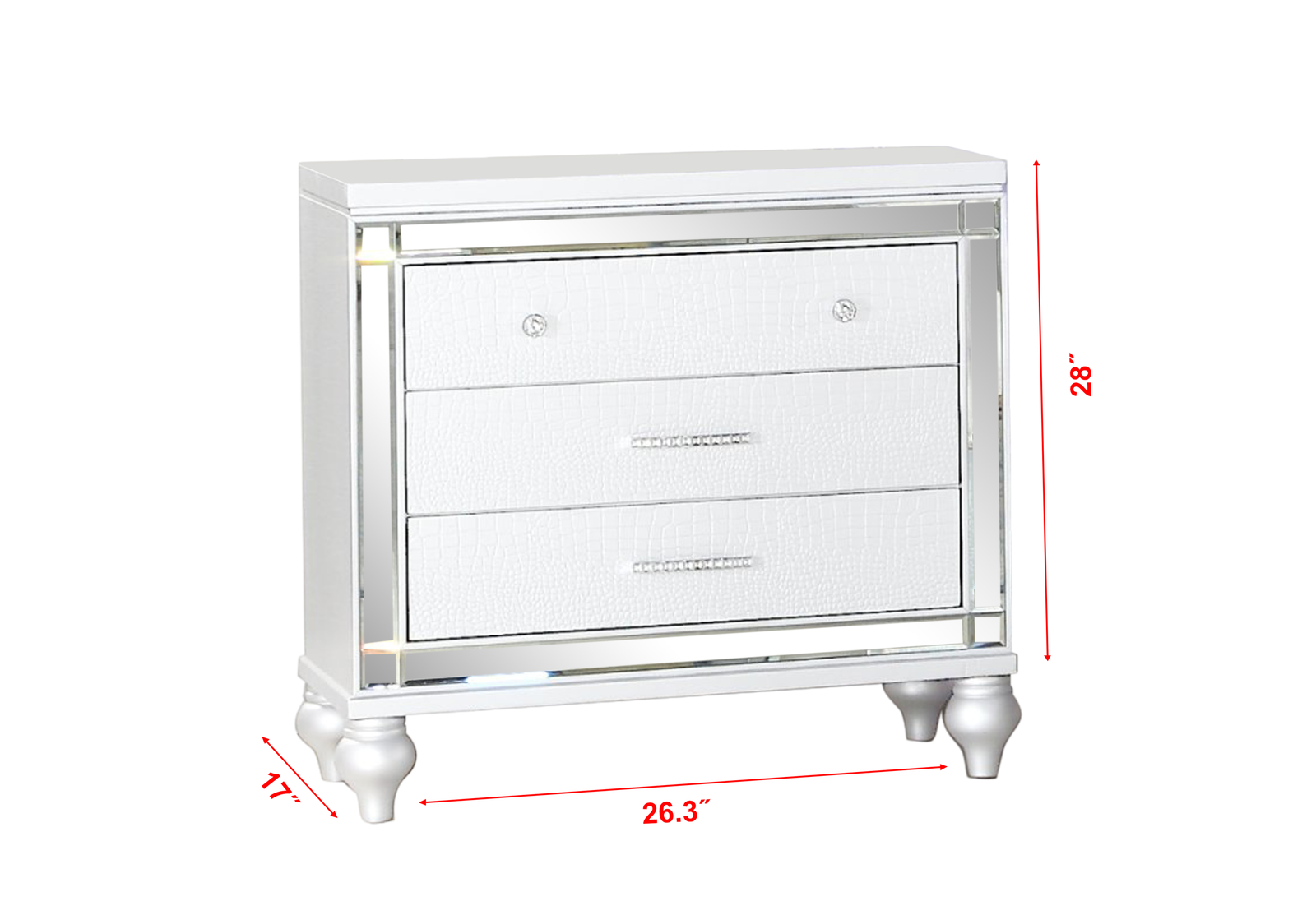 Specifications Place of Origin Viet Nam Main Color White Main Material Wood Product Style Contemporary,Modern Number of Drawers 3 Drawers Use Case Bedroom Dangerous Goods #dangerFlag# Dimensions & Weights Assembled Length (in.) 26.30 Assembled Width (in.) 17.00 Assembled Height (in.) 28.00 Weight (lbs) 55.12 Product Features Wood Type MDF Touched with Modern Style Spacious Drawers Diamond Drawer Pulls Description The Glamour Elegance Nightstand is both a functional storage solution and a dazzling piece of decor. Its mirror accents and gold-accented hardware bring an air of sophistication to your bedroom. It's perfect for your daily routines, adding a touch of Hollywood glam to your space.