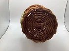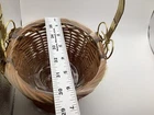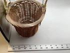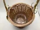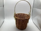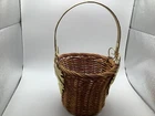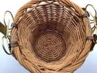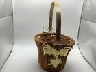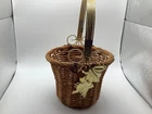 This small wicker flower planter vase features a metal handle and leaf design, although one leaf is missing. It has one compartment and is suitable for indoor use. The item is free-standing and does not require assembly. With a size of 7 inches in length, width, and 11 in height, this original piece is made of metal and wicker materials, with handles for easy transport. Perfect for adding a touch of rustic charm to your home décor, this handmade planter is ideal for displaying small plants or floral arrangements.
