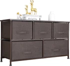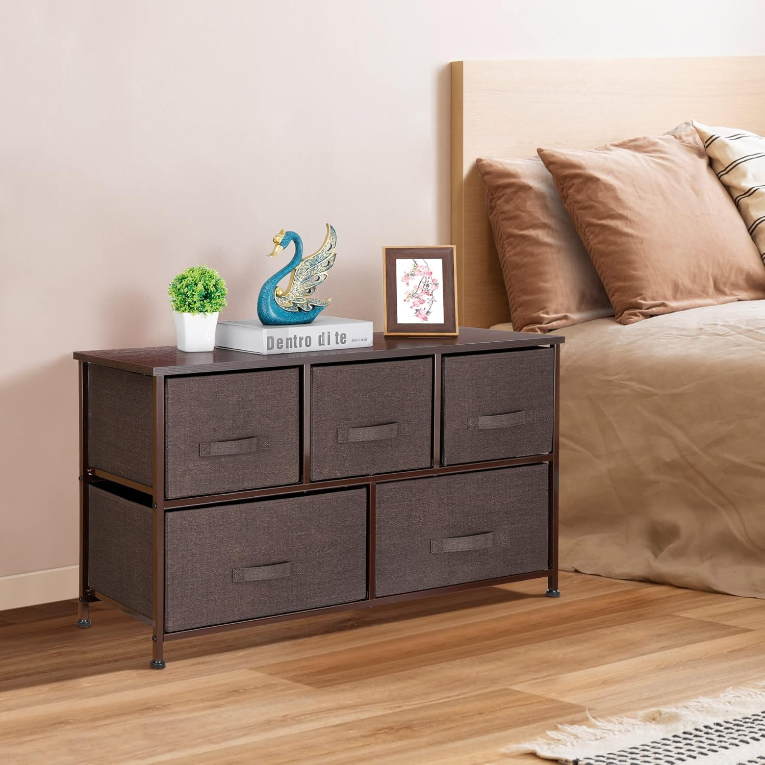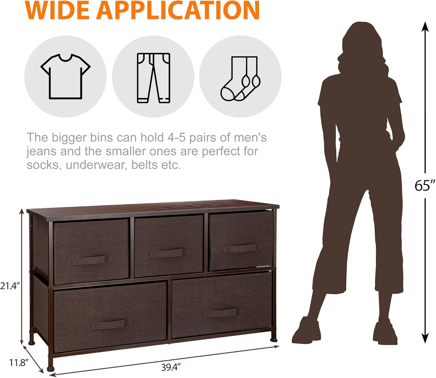 PREMIUM MATERIAL: Exquisite wooden table top board, air permeable removable fabric drawer, strong metal frame plus a beautiful P2 MDF table top board, provide fantastic functionality and earthy style. The whole construction lends exceptional strength and ensures that the dresser and changing table will endure over time WIDE APPLICATION: Suitable for bedroom, living room, laundry area, closet, nursery, guest room, entryway, college dorm room, apartment solutions...etc. Use it in cloakroom to offer a home for workout gear, leggings and pajamas or use as a dresser. Ample storage is also a gift you will treasure more with each passing year, as your baby – and your baby's wardrobe – grows 5 REMOVABLE & FOLDABLE BINS: Soft fabric drawers with reinforced base + Easy pull handle for quiet opening and closing + Removable Drawers fold flat for easy storage when not in use, the entire unit is portable, lightweight, and easy to relocate to different spaces Use in or out of the closet and keep clutter under control by storing all of your clothing and accessories in one convenient place DETAILS THAT MATTER: Dresser is equipped with 3 small and 2 large drawers. Adjustable levelers ensure stability on uneven surfaces. Water-based finish that meets stringent chemical emission standards. Plastic feet will not scratch flooring, and they are adjustable for uneven surfaces. Product size: 39.4*11.8*21.5in; Small drawers measures: 11.6*10.8*8.7in; Large drawers measures: 18.1*11*8.7in EASY TO INSTALL AND LOW MEINTANANCE: Easily wipe clean with a damp cloth. Minimal assembly required. Hardware and instructions are all included. Product Description Can be used as dressers for bedroom, storage cube dresser, 5 drawer dresser, small closet dresser, storage chest, living room dresser, sofa end tables, office supply storage or baby nursery table. Color: Espresso Materials: Steel Frame, P2 MDF board, Gray Board, Non-woven Fabric Product Size: 39.37" * 11.81" * 21.38" Net Weight: 21.19lbs Drawer capacity: 5 KG Desktop capacity: 10 KG Storing All Kinds of Daily Accessories in Limited Place It offers endless organizational possibilities! The simple and elegant appearance adds a comfortable highlight to your home decoration design. You can place it in a storage room and sort your and your family's belongings. Can be put in the child's room, cultivate the child's ability to organize; Also can serve as side table so you can put your beloved book in the drawer that leaves you nearest, read before going to bed. Table top can place lamp, photograph frame, alarm clock, adornment. Stability comes first, crafted with a wooden tabletop and metal frame, the dresser is stable and durable. Slim, lightweight design, easily fit into smaller spaces while still providing plenty of storage space. 4 adjustable feet allow you to use it on uneven surfaces and adds extra stability. Easy to assemble, with a simple structure, it's a breeze to assemble the storage unit.