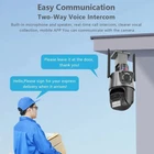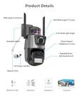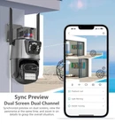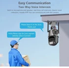 Main Feature: -Dual-lens camera: upper and lower 3.6MM lenses,3MP+3MP 4K picture quality is delicate and clearer; -Dual sensors and dual screens:F1.4 wide angle + F1.4 telefocus, for clearer monitoring at the same time; -Dual-light night vision: built-in infrared light + white light, long-distance supplementary light is more brilliant; -Advanced H.265 AI video compression technology, ultra-low bit rate, high-definition image quality -2.4G wireless network + RJ45 network port -2D/3D noise reduction, digital wide dynamic range -humanoid detection, tracking and capturing,Intelligent line mixing,area monitoring -Two-way voice intercom, two-way video simultaneous recording and playback -Smart alarm: motion triggered alarm, APP push notification and alarm recording -1P66 level waterproof, international lightning protection standard EC61000-4-5 -Supports ONVIF protocol and can be connected to third-party backend/platform -Support TF storage and cloud storage (need pay in iCSee app) -Smartphone APP name: "iCSEE" from Google Play or iOS App Store Packing List: 1x PTZ Camera 1x User Manual 1x Power Supply 1x Screws Bag P.S.: 1. Due to manual measurement, please allow an error of 1-3 cm. 2. Due to differences in different monitors, the picture may not reflect the actual color of the product. 3. The alarm method needs to be manually set to the required mode and scene to take effect.
