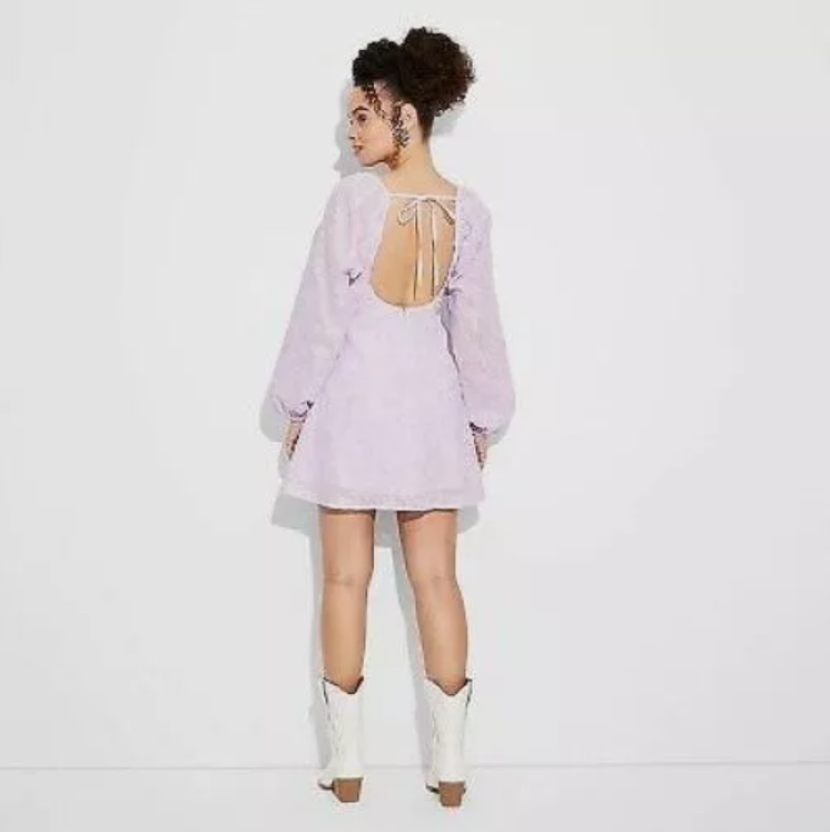 •Fit and flare cotton voile dress •Floral lace-like fabric in solid color •Full lining •Mini length •Open back with ties and zip closure •Bishop sleeves with elastic-cinched ends •Recycled polyester Description Fit and flare cotton voile dress from Wild Fable in a solid hue with elastic-cinched bishop sleeves. Made from midweight floral lace-like fabric with full lining. Features a mini-length silhouette, a sweetheart neckline with gathered detailing, an open back with string-tie fastening and a zipper closure. Pullover style completes the look with easy on and off. Wild Fable: A look for every story. Material: 100% Cotton Material Lining: 100% Recycled Polyester Garment Style: Long Sleeve, Back Tie, Side Zipper Garment Length: Mini Neckline: Scoop Fabric Name: Voile Cuff Type: No Cuff Garment Details: No Pocket, Zipper, Tie Garment back type: Open Fabric Weight Type: Midweight Fabric Garment sleeve style: Bishop Sleeve Care and Cleaning: Machine Wash, Tumble Dry